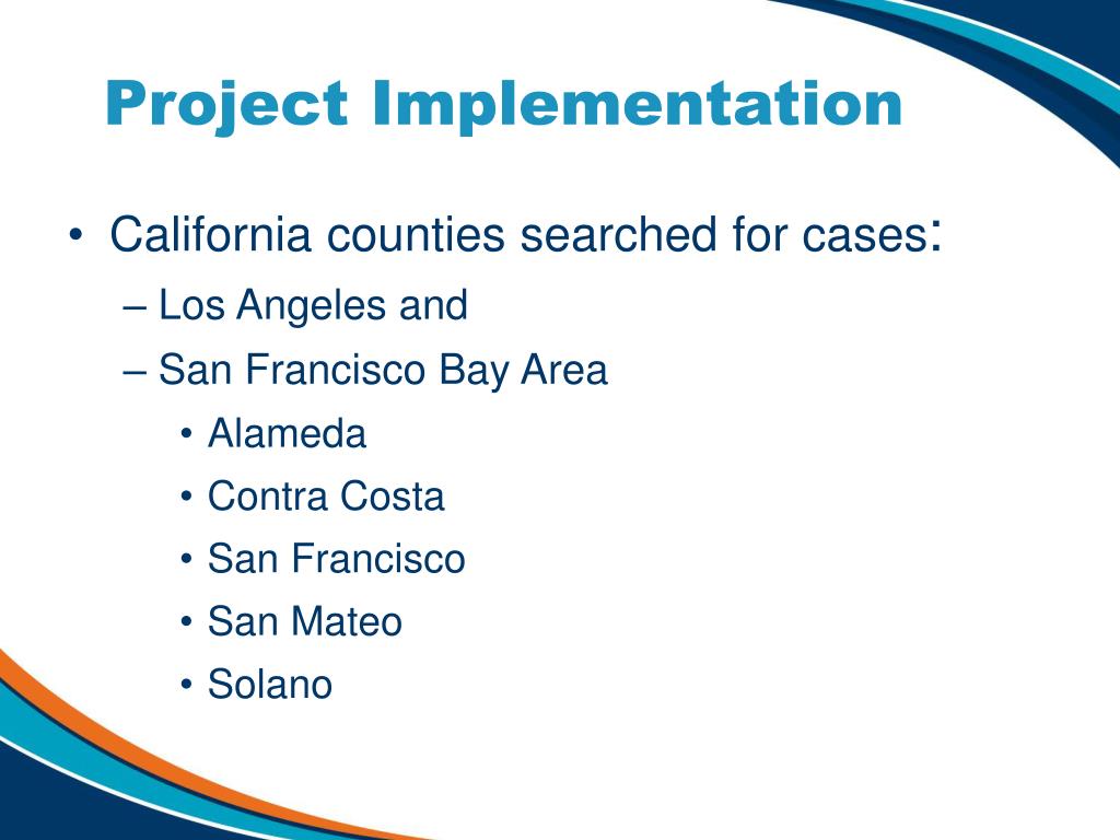 Project Implementation • California counties searched for cases: • Los Angeles and • San Francisco Bay Area • Alameda • Contra Costa • San Francisco • San Mateo • Solano
