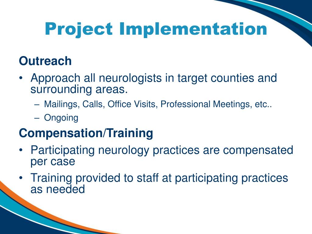 Project Implementation Outreach • Approach all neurologists in target counties and surrounding areas. • Mailings, Calls, Office Visits, Professional Meetings, etc.. • Ongoing Compensation/Training • Participating neurology practices are compensated per case • Training provided to staff at participating practices as needed