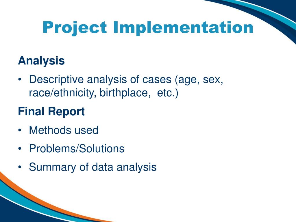 Project Implementation Analysis • Descriptive analysis of cases (age, sex, race/ethnicity, birthplace, etc.) Final Report • Methods used • Problems/Solutions • Summary of data analysis