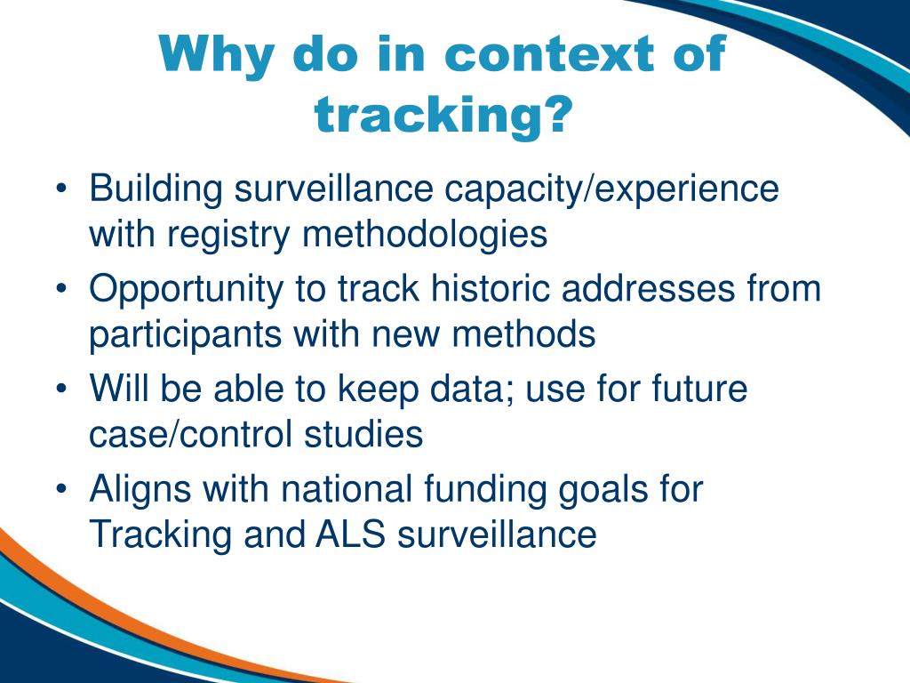 Why do in context of tracking? • Building surveillance capacity/experience with registry methodologies • Opportunity to track historic addresses from participants with new methods • Will be able to keep data; use for future case/control studies • Aligns with national funding goals for Tracking and ALS surveillance