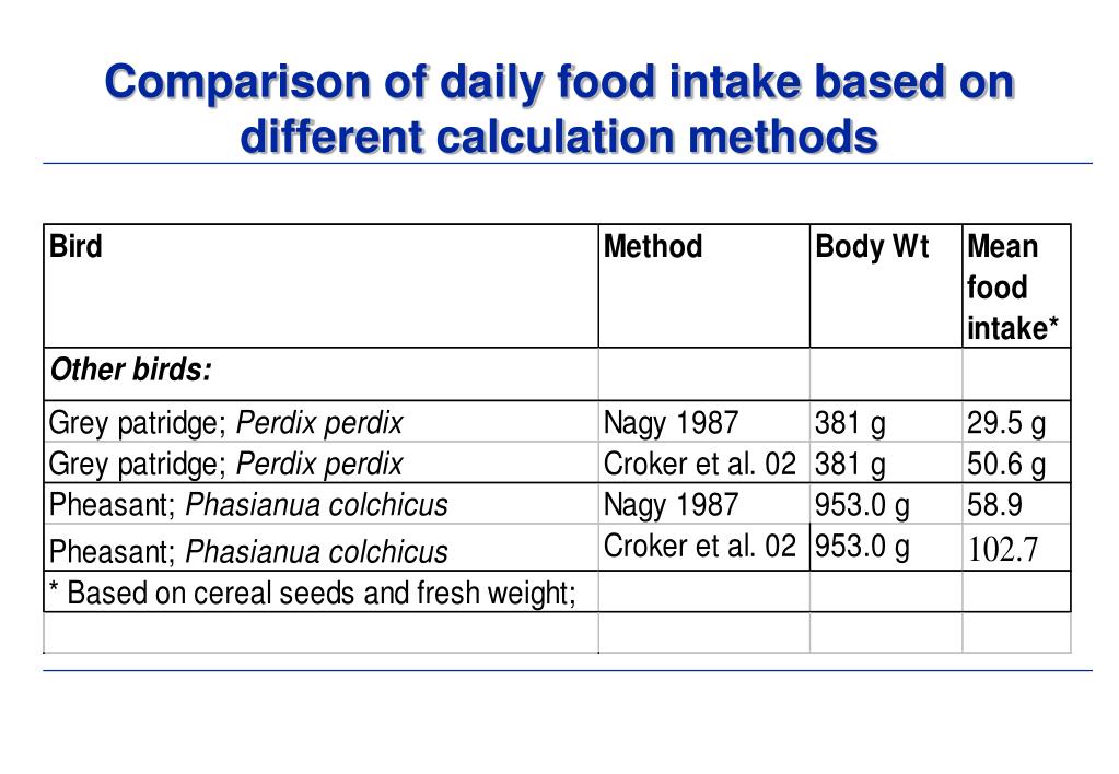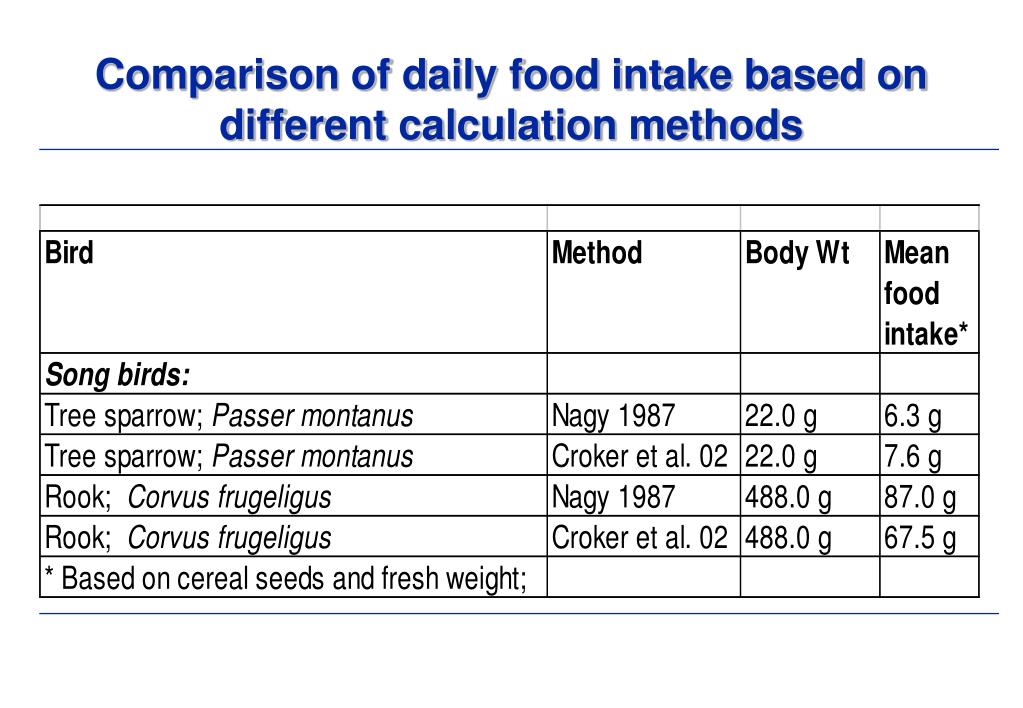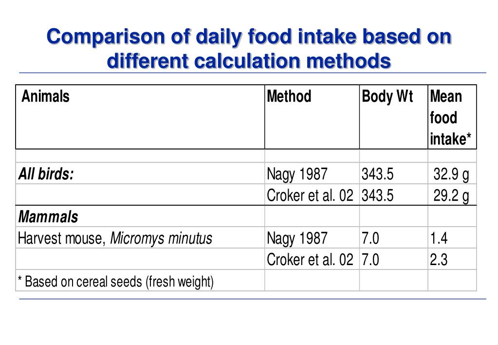 For all birds: log DFI = 0.651 x log BW - 0.188 For songbirds: log DFI = 0.85 x log BW - 0.4 For other birds: log DFI = 0.751 x log BW - 0.521 For mammals: log DFI = 0.822 x log BW - 0.629 Regression equations to predict dry weight intake for an animal (Nagy, 1987)