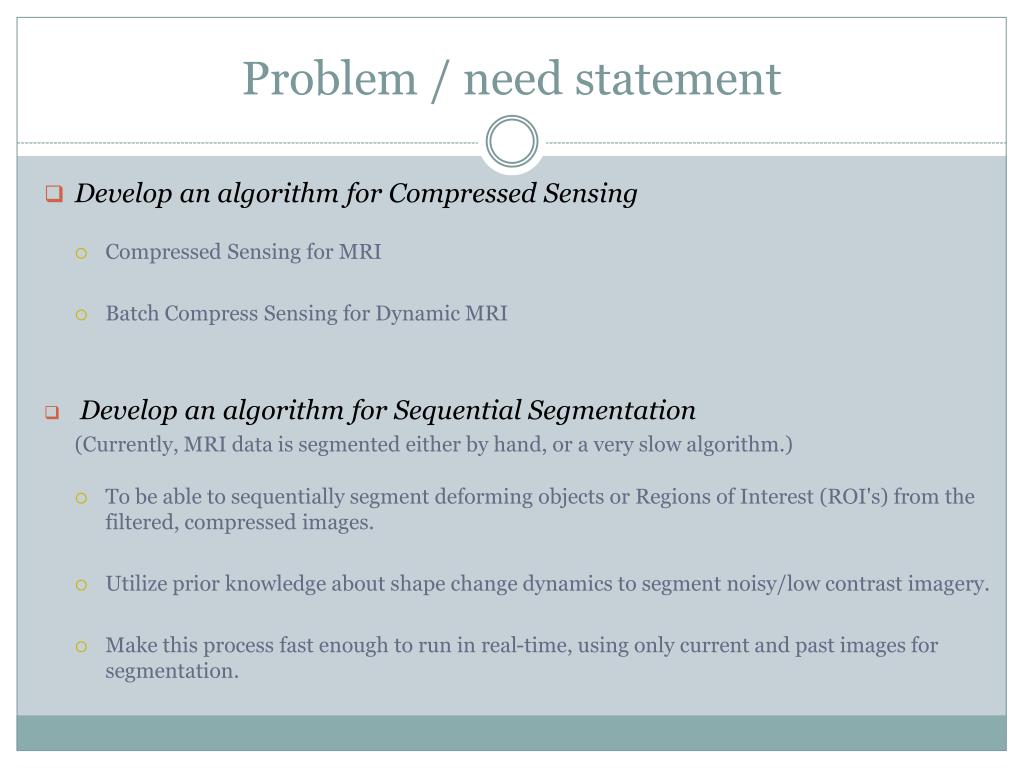 Problem / need statement • Develop an algorithm for Compressed Sensing • Compressed Sensing for MRI • Batch Compress Sensing for Dynamic MRI • Develop an algorithm for Sequential Segmentation (Currently, MRI data is segmented either by hand, or a very slow algorithm.) • To be able to sequentially segment deforming objects or Regions of Interest (ROI's) from the filtered, compressed images. • Utilize prior knowledge about shape change dynamics to segment noisy/low contrast imagery. • Make this process fast enough to run in real-time, using only current and past images for segmentation.