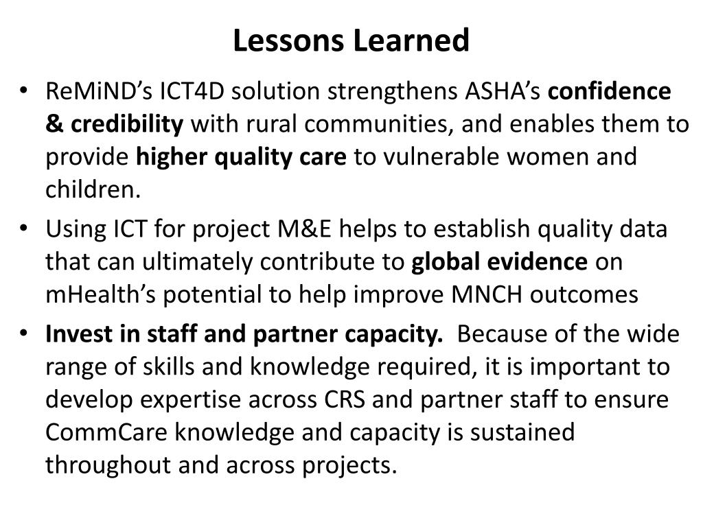 Lessons Learned • ReMiND’s ICT4D solution strengthens ASHA’s confidence & credibility with rural communities, and enables them to provide higher quality care to vulnerable women and children. • Using ICT for project M&E helps to establish quality data that can ultimately contribute to global evidence on mHealth’s potential to help improve MNCH outcomes • Invest in staff and partner capacity. Because of the wide range of skills and knowledge required, it is important to develop expertise across CRS and partner staff to ensure CommCare knowledge and capacity is sustained throughout and across projects.