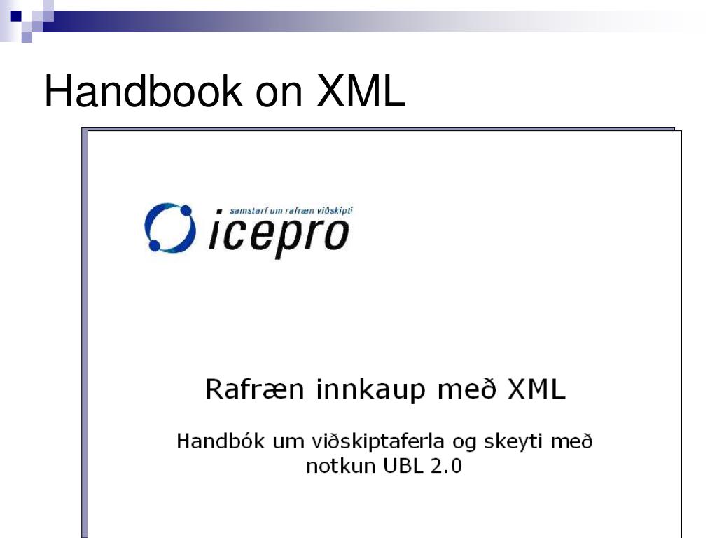 Hvers vegna XML ? • EDI ... • Hentar vel fyrirtækjum sem byggja viðskipti sín á upplýsingaflæði • Notað í point to point viðskiptum • XML • Umgjörð, stöðlun skjala, stöðlun viðskiptaferla • Almennt upplýsingamódel, ekki point to point • Nýtist minni aðilum og víðtækari notkun