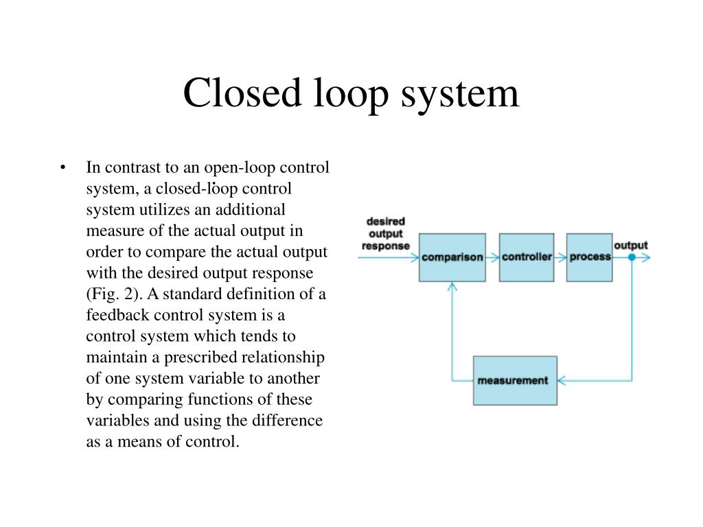 Closed loop system • In contrast to an open-loop control system, a closed-loop control system utilizes an additional measure of the actual output in order to compare the actual output with the desired output response (Fig. 2). A standard definition of a feedback control system is a control system which tends to maintain a prescribed relationship of one system variable to another by comparing functions of these variables and using the difference as a means of control. .