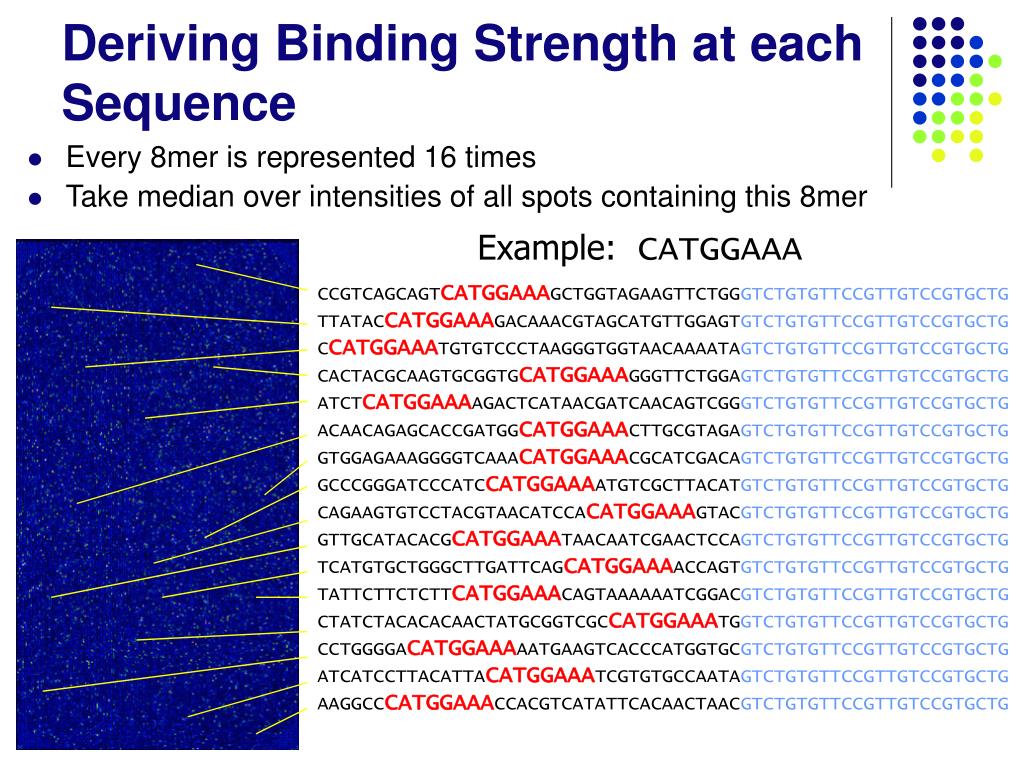Deriving Binding Strength at each Sequence • Every 8mer is represented 16 times • Take median over intensities of all spots containing this 8mer Example: CATGGAAA CCGTCAGCAGTCATGGAAAGCTGGTAGAAGTTCTGGGTCTGTGTTCCGTTGTCCGTGCTG TTATACCATGGAAAGACAAACGTAGCATGTTGGAGTGTCTGTGTTCCGTTGTCCGTGCTG CCATGGAAATGTGTCCCTAAGGGTGGTAACAAAATAGTCTGTGTTCCGTTGTCCGTGCTG CACTACGCAAGTGCGGTGCATGGAAAGGGTTCTGGAGTCTGTGTTCCGTTGTCCGTGCTG ATCTCATGGAAAAGACTCATAACGATCAACAGTCGGGTCTGTGTTCCGTTGTCCGTGCTG ACAACAGAGCACCGATGGCATGGAAACTTGCGTAGAGTCTGTGTTCCGTTGTCCGTGCTG GTGGAGAAAGGGGTCAAACATGGAAACGCATCGACAGTCTGTGTTCCGTTGTCCGTGCTG GCCCGGGATCCCATCCATGGAAAATGTCGCTTACATGTCTGTGTTCCGTTGTCCGTGCTG CAGAAGTGTCCTACGTAACATCCACATGGAAAGTACGTCTGTGTTCCGTTGTCCGTGCTG GTTGCATACACGCATGGAAATAACAATCGAACTCCAGTCTGTGTTCCGTTGTCCGTGCTG TCATGTGCTGGGCTTGATTCAGCATGGAAAACCAGTGTCTGTGTTCCGTTGTCCGTGCTG TATTCTTCTCTTCATGGAAACAGTAAAAAATCGGACGTCTGTGTTCCGTTGTCCGTGCTG CTATCTACACACAACTATGCGGTCGCCATGGAAATGGTCTGTGTTCCGTTGTCCGTGCTG CCTGGGGACATGGAAAAATGAAGTCACCCATGGTGCGTCTGTGTTCCGTTGTCCGTGCTG ATCATCCTTACATTACATGGAAATCGTGTGCCAATAGTCTGTGTTCCGTTGTCCGTGCTG AAGGCCCATGGAAACCACGTCATATTCACAACTAACGTCTGTGTTCCGTTGTCCGTGCTG