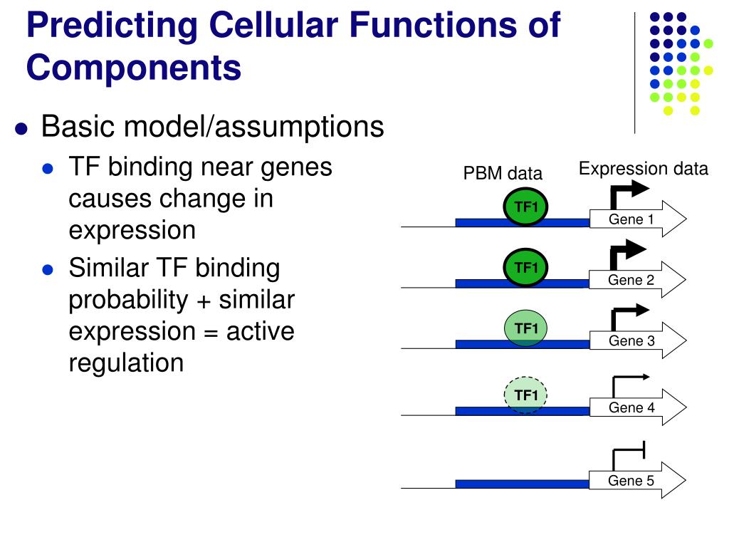 Predicting Cellular Functions of Components • Basic model/assumptions • TF binding near genes causes change in expression • Similar TF binding probability + similar expression = active regulation Expression data PBM data TF1 Gene 1 TF1 Gene 2 TF1 Gene 3 TF1 Gene 4 Gene 5