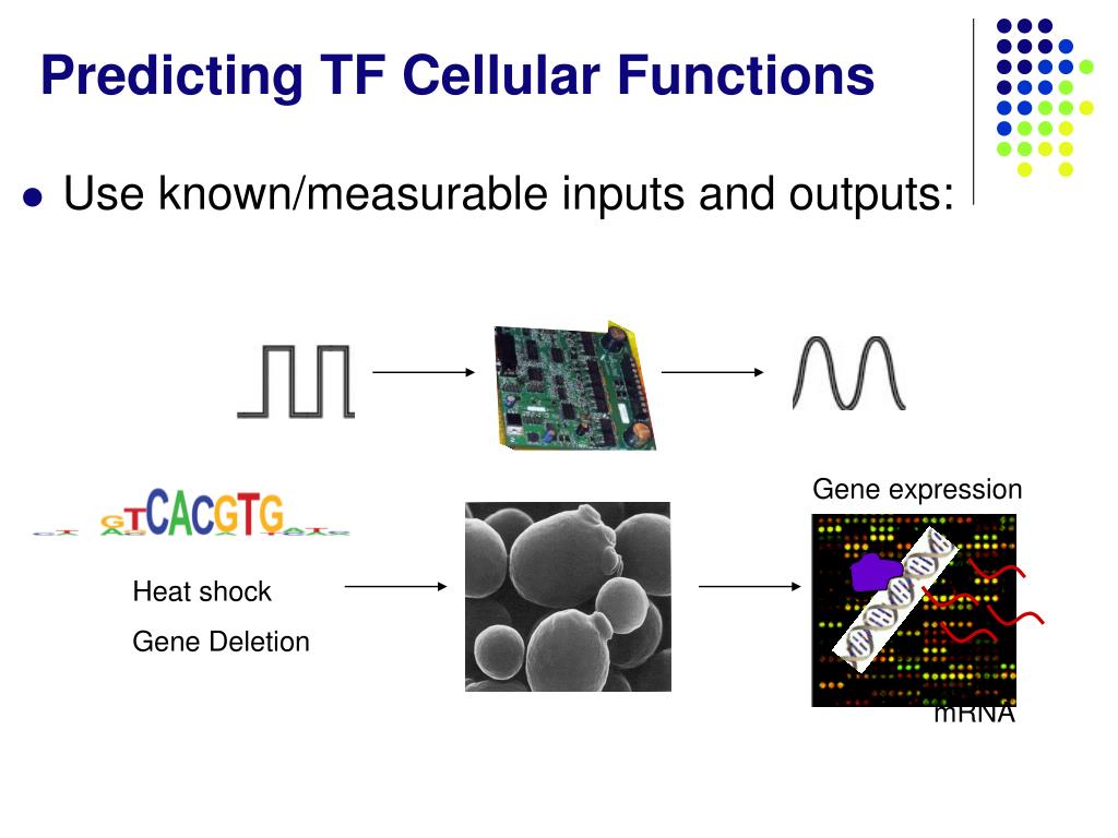 Predicting TF Cellular Functions • Use known/measurable inputs and outputs: Gene expression Heat shock Gene Deletion mRNA