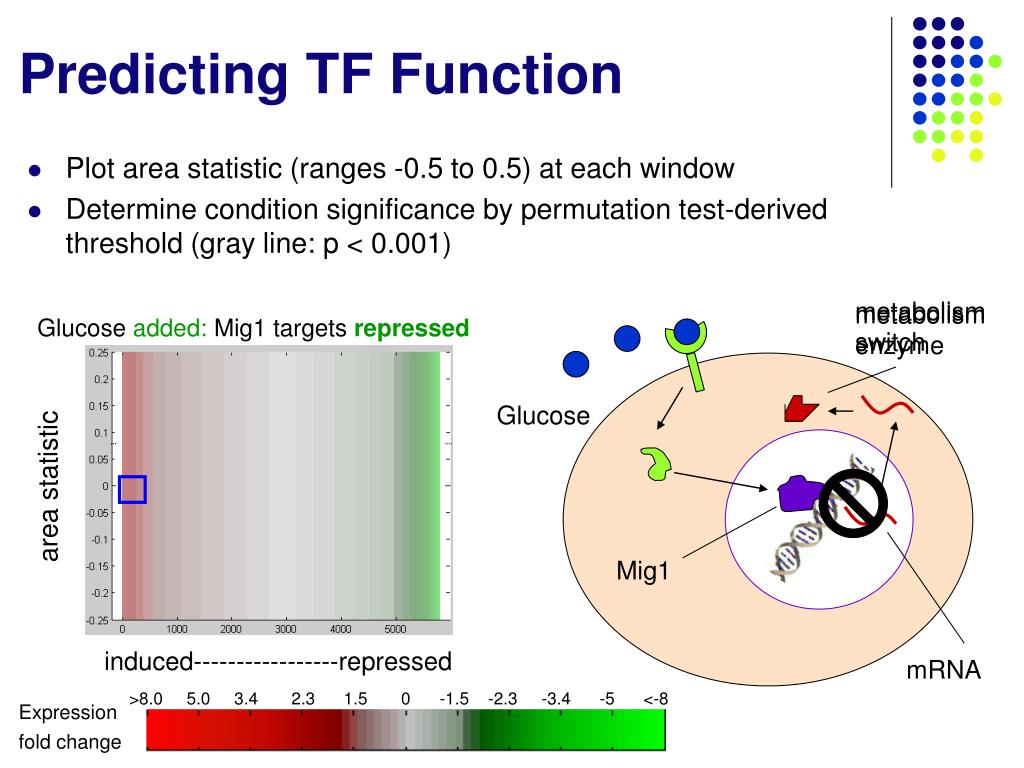 Predicting TF Function • Plot area statistic (ranges -0.5 to 0.5) at each window • Determine condition significance by permutation test-derived threshold (gray line: p < 0.001) metabolism switch metabolism enzyme Glucose added: Mig1 targets repressed Glucose area statistic Mig1 induced-----------------repressed mRNA >8.0 5.0 3.4 2.3 1.5 0 -1.5 -2.3 -3.4 -5 <-8 Expression fold change