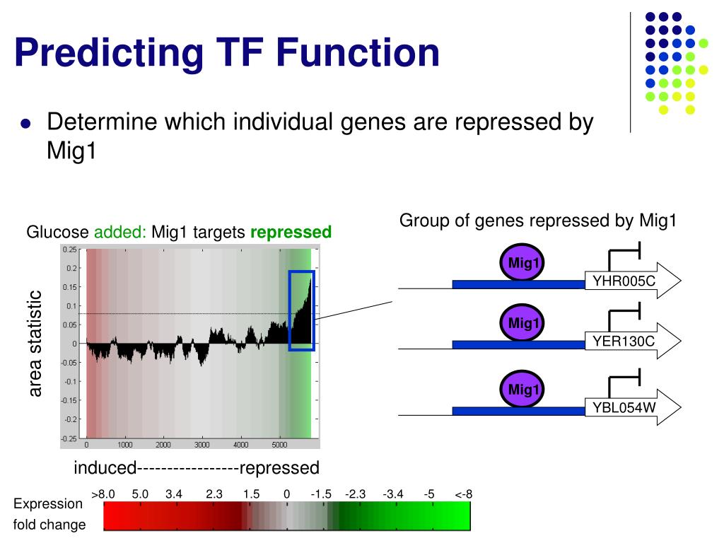 Predicting TF Function • Determine which individual genes are repressed by Mig1 Group of genes repressed by Mig1 Glucose added: Mig1 targets repressed Mig1 YHR005C Mig1 area statistic YER130C Mig1 YBL054W induced-----------------repressed >8.0 5.0 3.4 2.3 1.5 0 -1.5 -2.3 -3.4 -5 <-8 Expression fold change