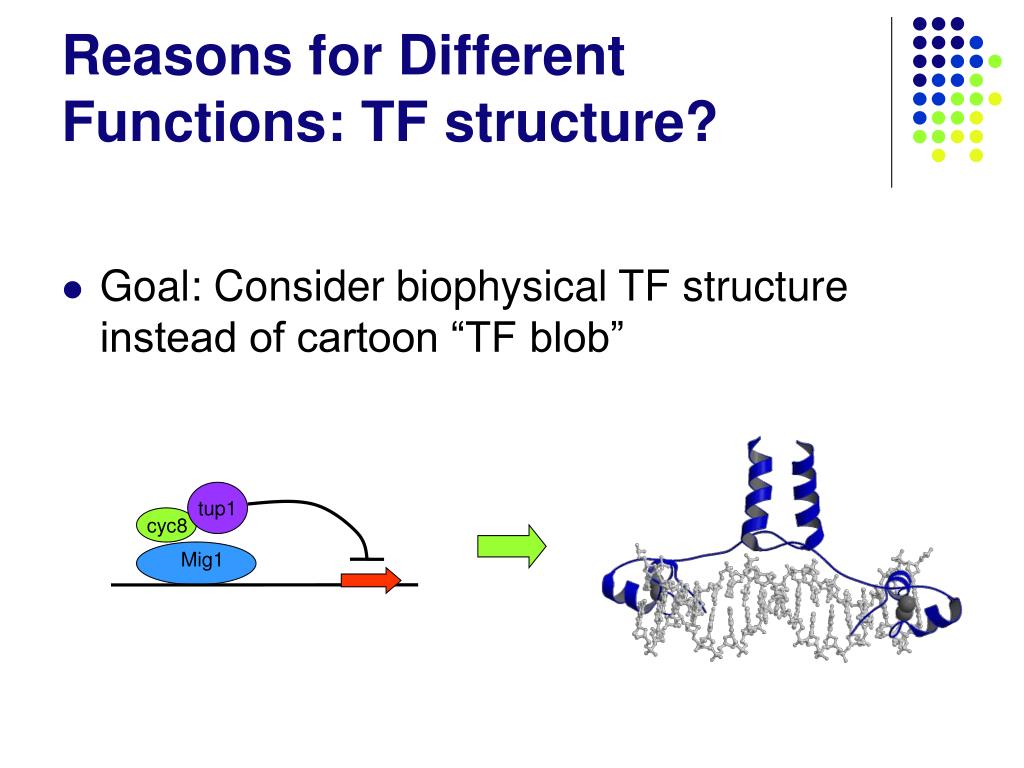 Reasons for Different Functions: TF structure? • Goal: Consider biophysical TF structure instead of cartoon “TF blob” tup1 cyc8 Mig1