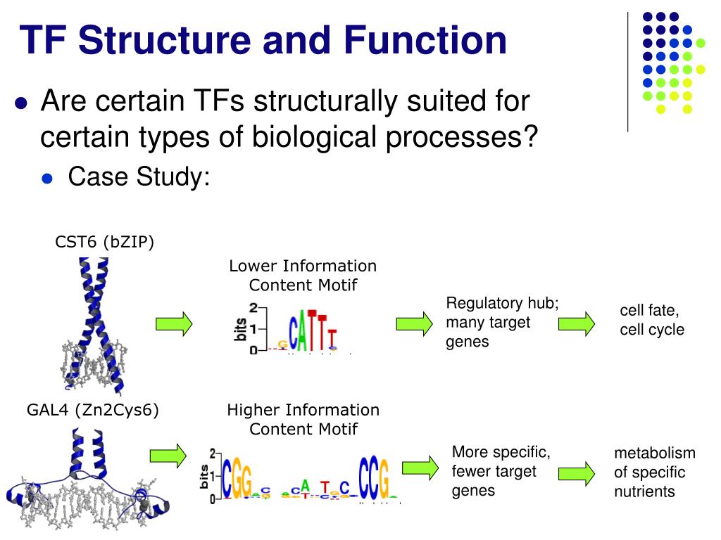 TF Structure and Function • Are certain TFs structurally suited for certain types of biological processes? • Case Study: CST6 (bZIP) Lower Information Content Motif Regulatory hub; many target genes cell fate, cell cycle GAL4 (Zn2Cys6) Higher Information Content Motif More specific, fewer target genes metabolism of specific nutrients