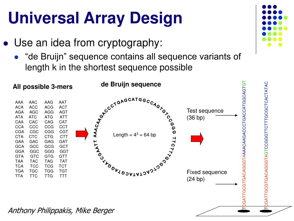 T T C T T T G C G C T C A C T A T A C G T A G G A T C G A A T T A A A C A A G A C C C T G A G C A T G G C C A G T G T C C G G G Universal Array Design • Use an idea from cryptography: • “de Bruijn” sequence contains all sequence variants of length k in the shortest sequence possible de Bruijn sequence All possible 3-mers AAA AAC AAG AAT ACA ACC ACG ACT AGA AGC AGG AGT ATA ATC ATG ATT CAA CAC CAG CAT CCA CCC CCG CCT CGA CGC CGG CGT CTA CTC CTG CTT GAA GAC GAG GAT GCA GCC GCG GCT GGA GGC GGG GGT GTA GTC GTG GTT TAA TAC TAG TAT TCA TCC TCG TCT TGA TGC TGG TGT TTA TTC TTG TTT Test sequence (36 bp) TCGATTGCGTGACAGGGTAAAACAAGACCCTGACCATGGCAGTGT TCGATTGCGTGACAGGGTAGTCCGGGTTCTTTGCGCTCACTATAC Length = 43 = 64 bp Fixed sequence (24 bp) Anthony Philippakis, Mike Berger