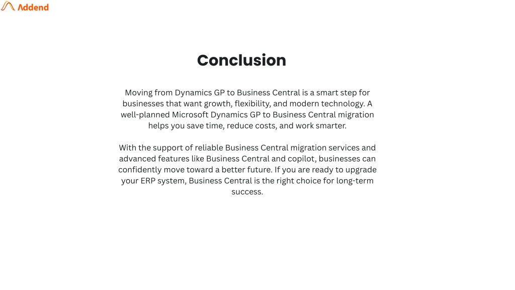 6. Conclusion Moving from Dynamics GP to Business Central is a smart step for businesses that want growth, flexibility, and modern technology. A well-planned Microsoft Dynamics GP to Business Central migration helps you save time, reduce costs, and work smarter. With the support of reliable Business Central migration services and advanced features like Business Central and copilot, businesses can confidently move toward a better future. If you are ready to upgrade your ERP system, Business Central is the right choice for long-term success.