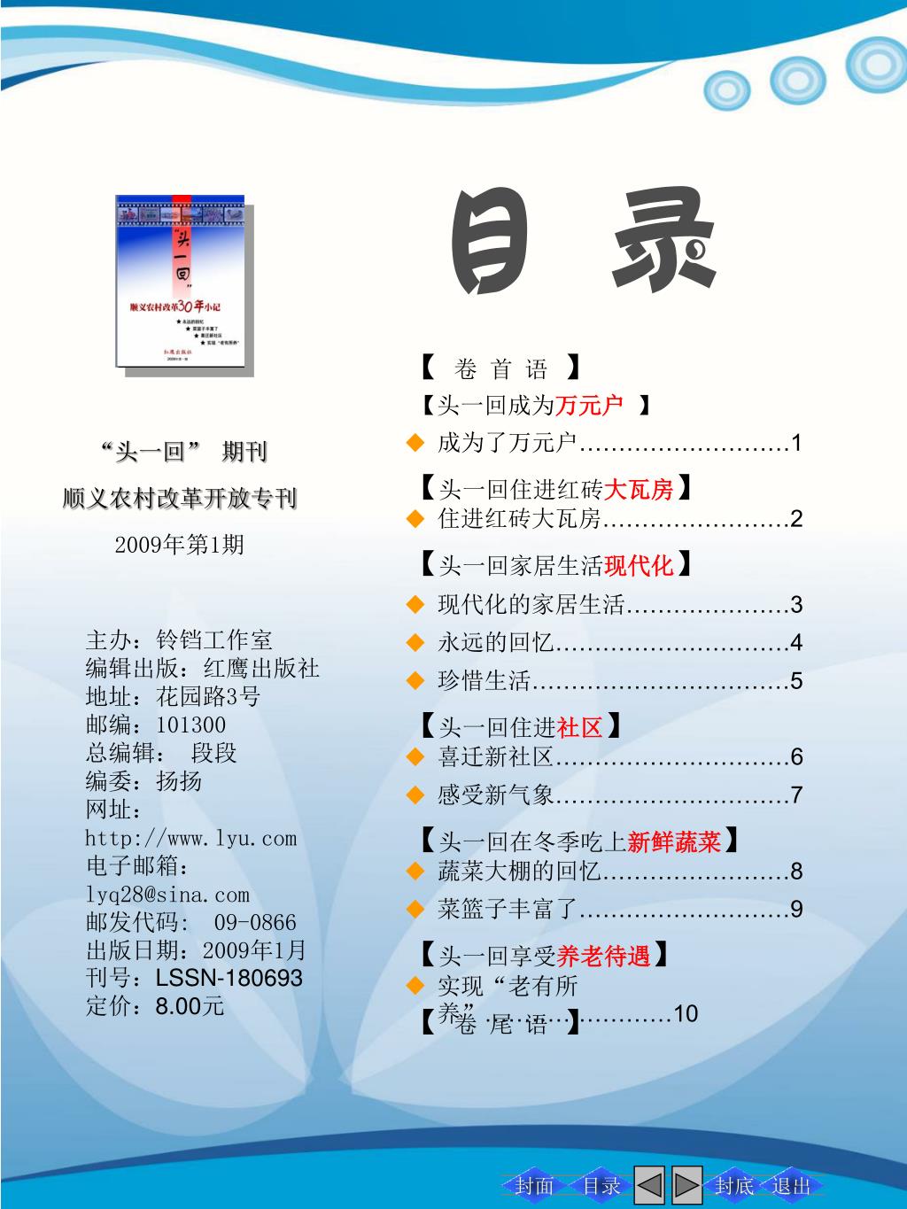 封面 目录 封底 退出 【卷 首 语】 【头一回成为万元户 】 成为了万元户………………………1 “头一回” 期刊 顺义农村改革开放专刊 2009年第1期 【头一回住进红砖大瓦房】 住进红砖大瓦房……………………2 【头一回家居生活现代化】 现代化的家居生活…………………3 主办:铃铛工作室 编辑出版:红鹰出版社 地址:花园路3号 邮编:101300 总编辑: 段段 编委:扬扬 网址:http://www.lyu.com 电子邮箱:lyq28@sina.com 邮发代码: 09-0866 出版日期:2009年1月 刊号:LSSN-180693 定价:8.00元 永远的回忆…………………………4 珍惜生活……………………………5 【头一回住进社区】 喜迁新社区…………………………6 感受新气象…………………………7 【头一回在冬季吃上新鲜蔬菜】 蔬菜大棚的回忆……………………8 菜篮子丰富了………………………9 【头一回享受养老待遇】 实现“老有所养”……………………10 【卷 尾 语】