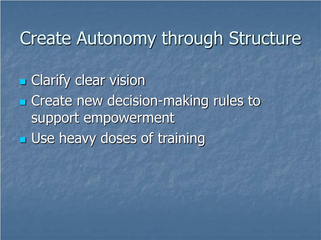 Create Autonomy through Structure • Clarify clear vision • Create new decision-making rules to support empowerment • Use heavy doses of training