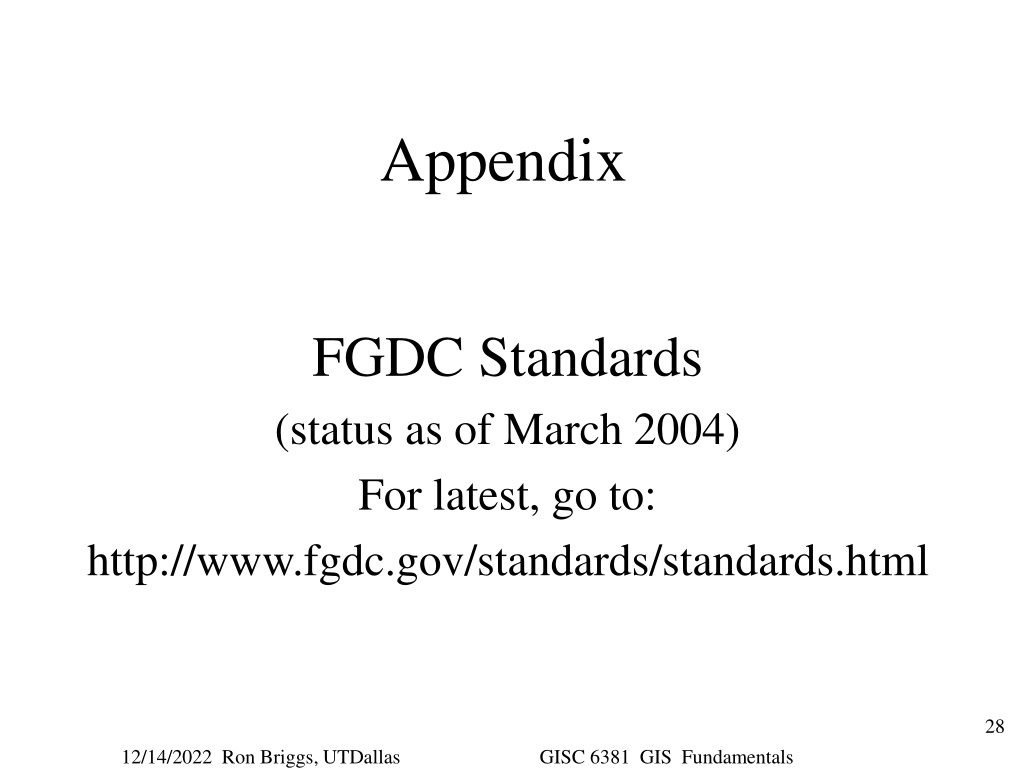 Appendix FGDC Standards (status as of March 2004) For latest, go to: http://www.fgdc.gov/standards/standards.html