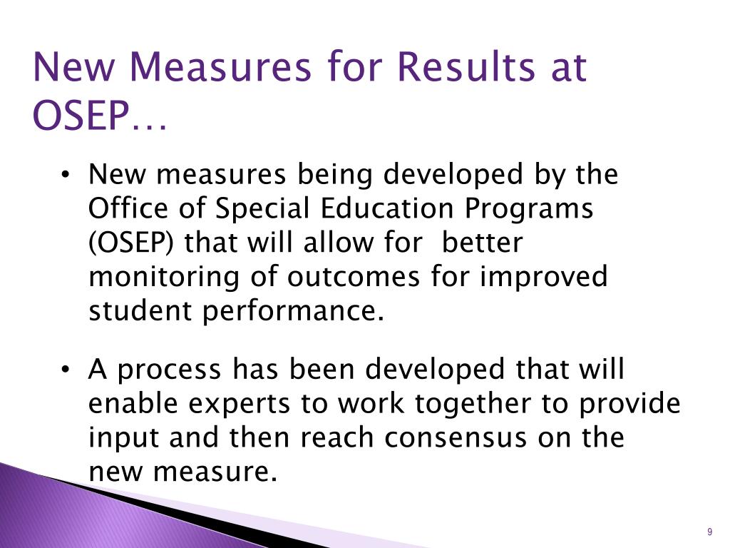 New Measures for Results at OSEP… • New measures being developed by the Office of Special Education Programs (OSEP) that will allow for better monitoring of outcomes for improved student performance. • A process has been developed that will enable experts to work together to provide input and then reach consensus on the new measure.