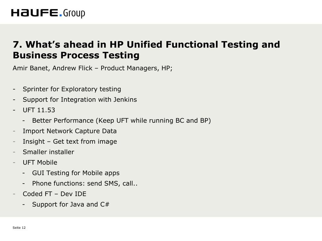 7. What’s ahead in HP Unified Functional Testing and Business Process Testing • Amir Banet, Andrew Flick – Product Managers, HP; • Sprinter for Exploratory testing • Support for Integration with Jenkins • UFT 11.53 • Better Performance (Keep UFT while running BC and BP) • Import Network Capture Data • Insight – Get text from image • Smaller installer • UFT Mobile • GUI Testing for Mobile apps • Phone functions: send SMS, call.. • Coded FT – Dev IDE • Support for Java and C#