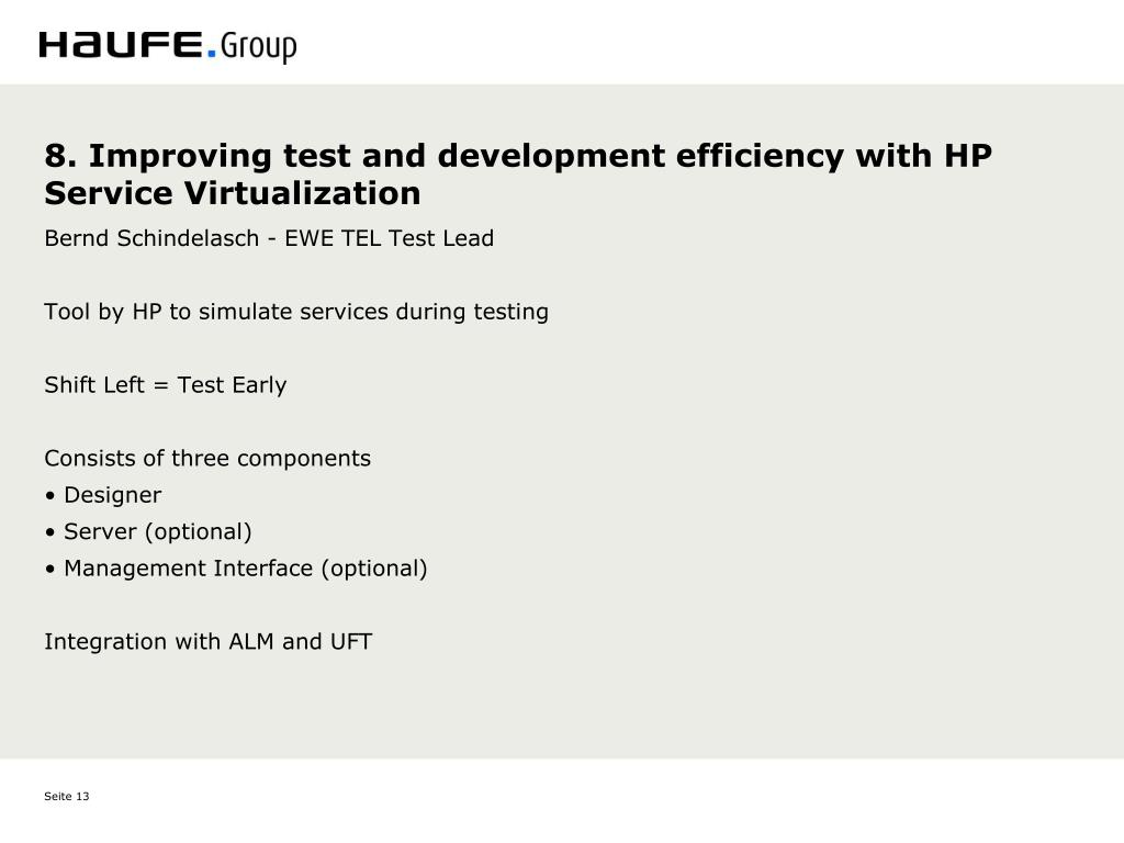 8. Improving test and development efficiency with HP Service Virtualization • Bernd Schindelasch - EWE TEL Test Lead • Tool by HP to simulate services during testing • Shift Left = Test Early • Consists of three components • • Designer • • Server (optional) • • Management Interface (optional) • Integration with ALM and UFT