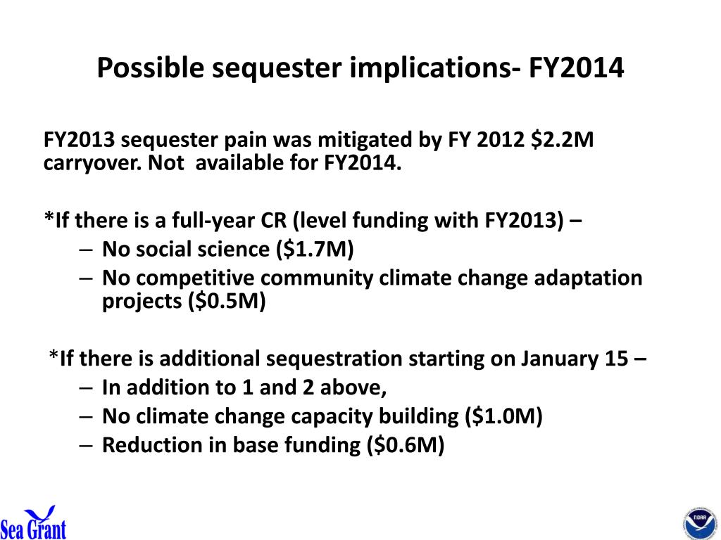 Possible sequester implications- FY2014 FY2013 sequester pain was mitigated by FY 2012 $2.2M carryover. Not available for FY2014. *If there is a full-year CR (level funding with FY2013) – • No social science ($1.7M) • No competitive community climate change adaptation projects ($0.5M) *If there is additional sequestration starting on January 15 – • In addition to 1 and 2 above, • No climate change capacity building ($1.0M) • Reduction in base funding ($0.6M)