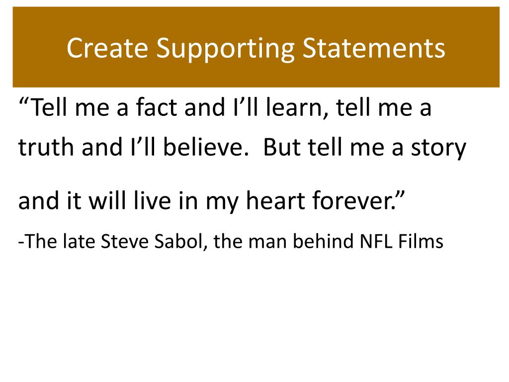 Create Supporting Statements “Tell me a fact and I’ll learn, tell me a truth and I’ll believe. But tell me a story and it will live in my heart forever.” -The late Steve Sabol, the man behind NFL Films