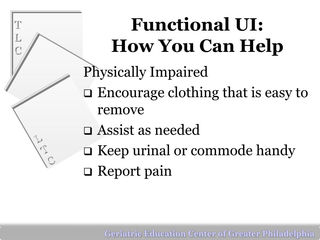 Functional UI: How You Can Help Physically Impaired • Encourage clothing that is easy to remove • Assist as needed • Keep urinal or commode handy • Report pain
