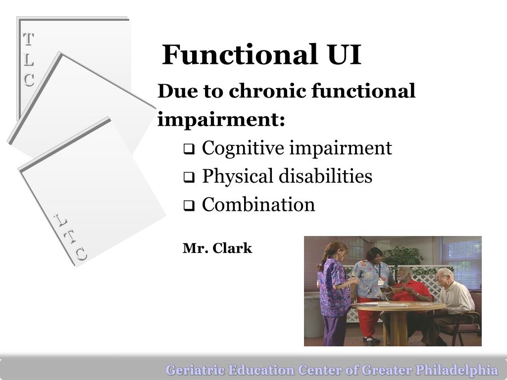 Functional UI Due to chronic functional impairment: • Cognitive impairment • Physical disabilities • Combination Mr. Clark