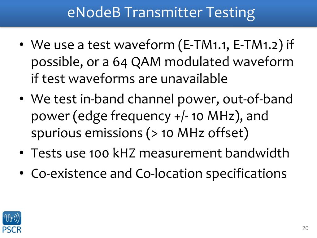 eNodeB Transmitter Testing • We use a test waveform (E-TM1.1, E-TM1.2) if possible, or a 64 QAM modulated waveform if test waveforms are unavailable • We test in-band channel power, out-of-band power (edge frequency +/- 10 MHz), and spurious emissions (> 10 MHz offset) • Tests use 100 kHZ measurement bandwidth • Co-existence and Co-location specifications