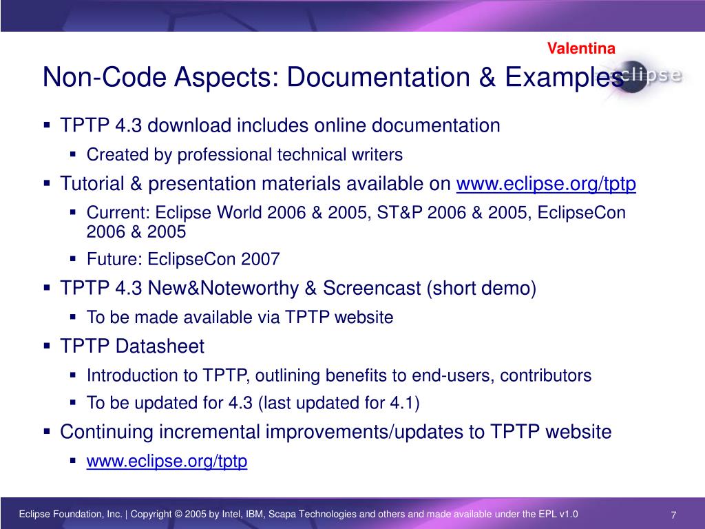Valentina Non-Code Aspects: Documentation & Examples • TPTP 4.3 download includes online documentation • Created by professional technical writers • Tutorial & presentation materials available on www.eclipse.org/tptp • Current: Eclipse World 2006 & 2005, ST&P 2006 & 2005, EclipseCon 2006 & 2005 • Future: EclipseCon 2007 • TPTP 4.3 New&Noteworthy & Screencast (short demo) • To be made available via TPTP website • TPTP Datasheet • Introduction to TPTP, outlining benefits to end-users, contributors • To be updated for 4.3 (last updated for 4.1) • Continuing incremental improvements/updates to TPTP website • www.eclipse.org/tptp