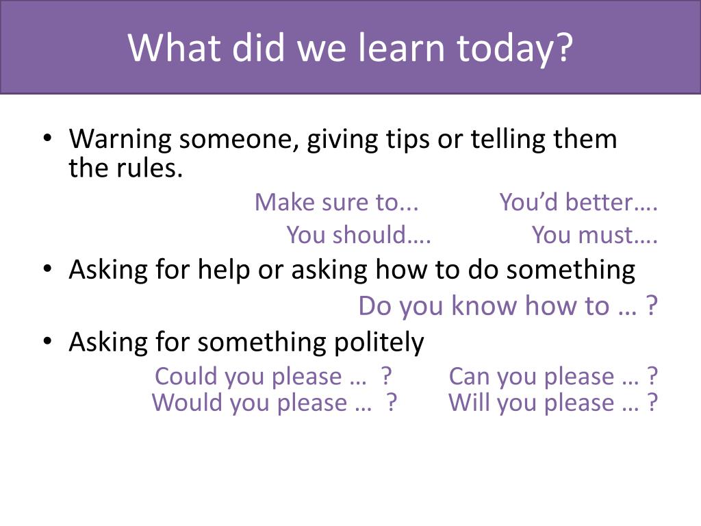 What did we learn today? • Warning someone, giving tips or telling them the rules. Make sure to... You’d better…. You should…. You must…. • Asking for help or asking how to do something Do you know how to … ? • Asking for something politely • Could you please … ? Can you please … ?Would you please … ? Will you please … ?
