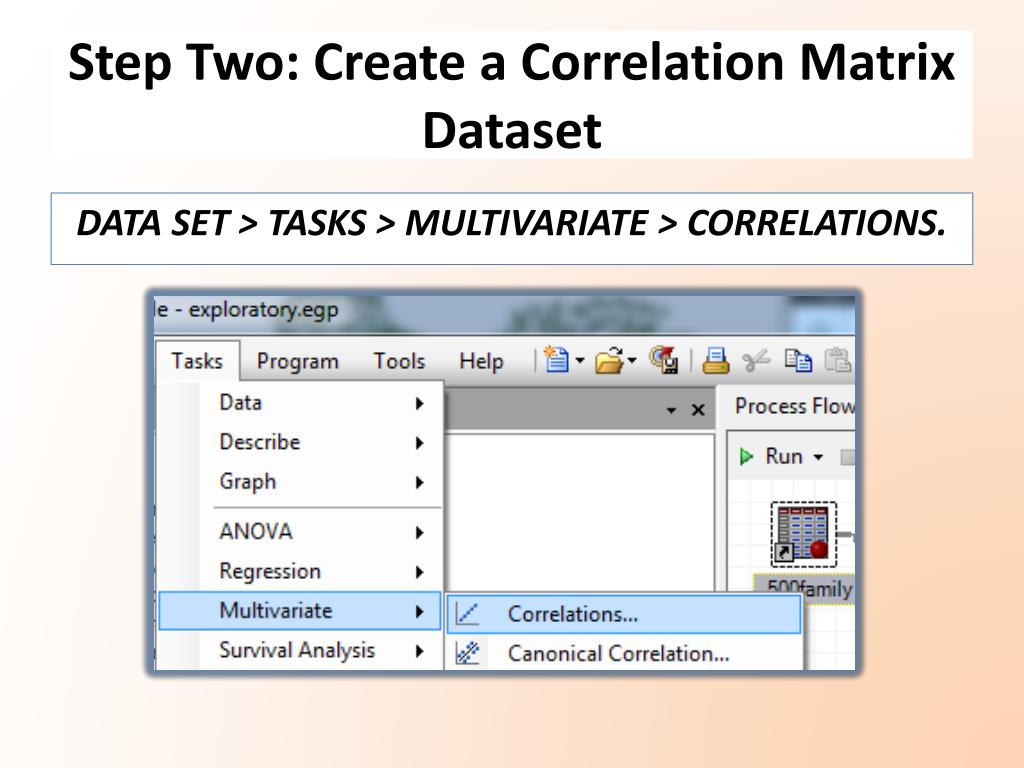 Step Two: Create a Correlation Matrix Dataset DATA SET > TASKS > MULTIVARIATE > CORRELATIONS.