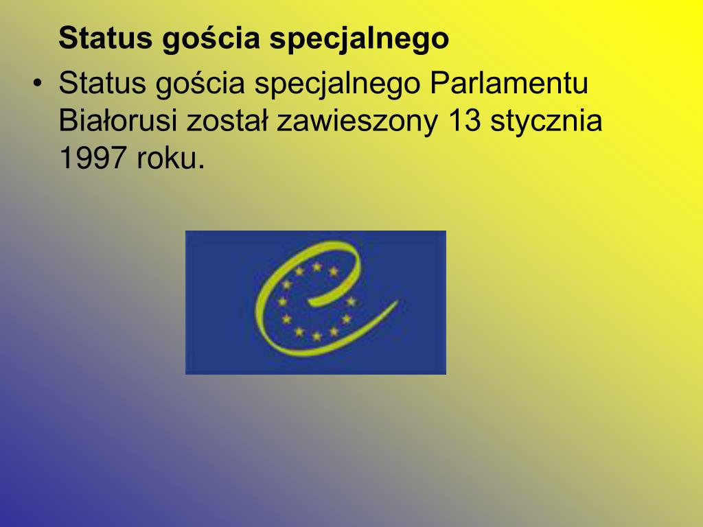 Status gościa specjalnego • Status gościa specjalnego Parlamentu Białorusi został zawieszony 13 stycznia 1997 roku.