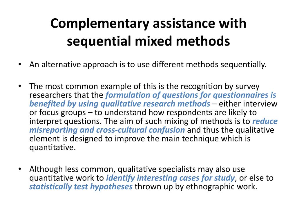 Complementary assistance with sequential mixed methods • An alternative approach is to use different methods sequentially. • The most common example of this is the recognition by survey researchers that the formulation of questions for questionnaires is benefited by using qualitative research methods – either interview or focus groups – to understand how respondents are likely to interpret questions. The aim of such mixing of methods is to reduce misreporting and cross-cultural confusion and thus the qualitative element is designed to improve the main technique which is quantitative. • Although less common, qualitative specialists may also use quantitative work to identify interesting cases for study, or else to statistically test hypotheses thrown up by ethnographic work.