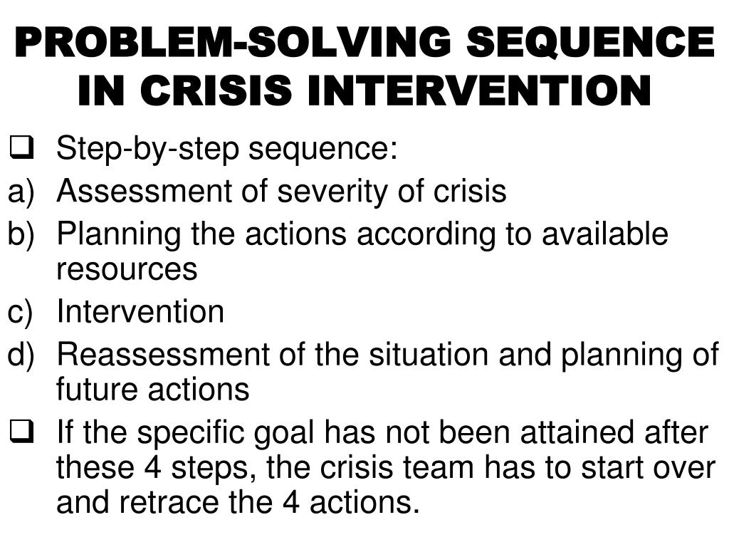 PROBLEM-SOLVING SEQUENCE IN CRISIS INTERVENTION • Step-by-step sequence: • Assessment of severity of crisis • Planning the actions according to available resources • Intervention • Reassessment of the situation and planning of future actions • If the specific goal has not been attained after these 4 steps, the crisis team has to start over and retrace the 4 actions.