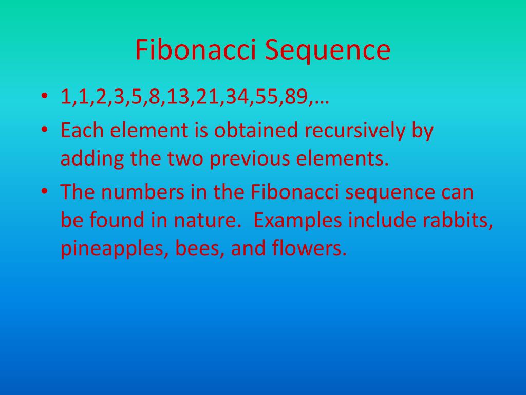 Fibonacci Sequence Fibonacci Sequence • 1,1,2,3,5,8,13,21,34,55,89,… • Each element is obtained recursively by adding the two previous elements. • The numbers in the Fibonacci sequence can be found in nature. Examples include rabbits, pineapples, bees, and flowers.