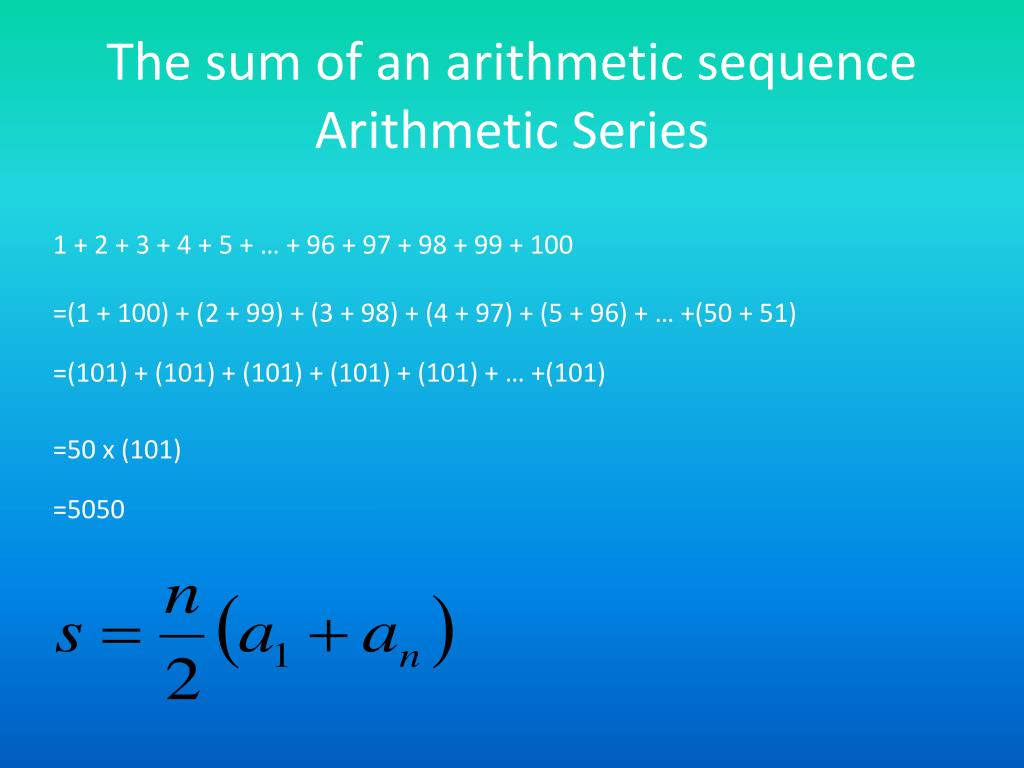The sum of an arithmetic sequenceArithmetic Series 1 + 2 + 3 + 4 + 5 + … + 96 + 97 + 98 + 99 + 100 =(1 + 100) + (2 + 99) + (3 + 98) + (4 + 97) + (5 + 96) + … +(50 + 51) =(101) + (101) + (101) + (101) + (101) + … +(101) =50 x (101) =5050