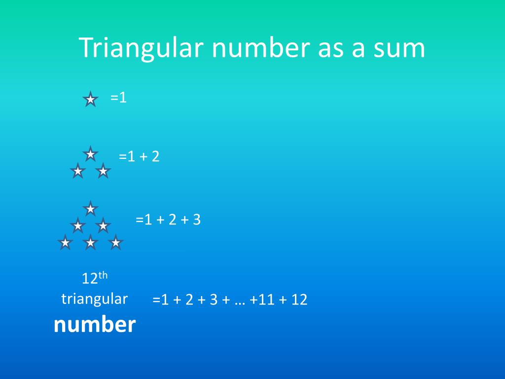 Triangular number as a sum =1 =1 + 2 =1 + 2 + 3 12th triangular number =1 + 2 + 3 + … +11 + 12