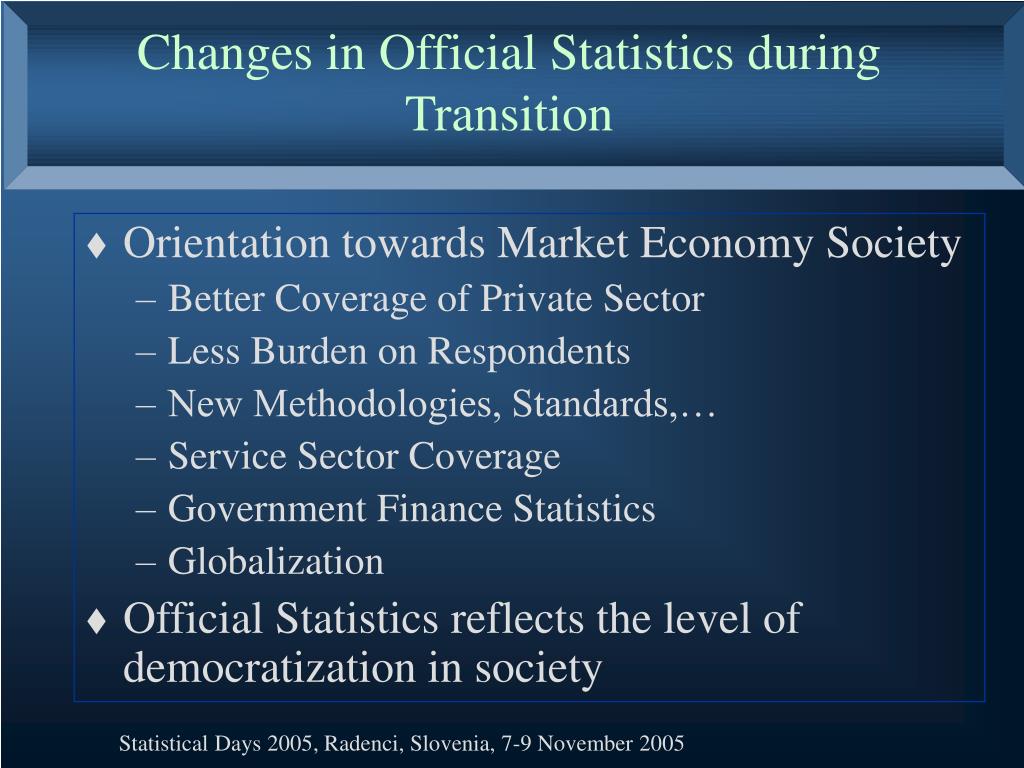 Changes in Official Statistics during Transition • Orientation towards Market Economy Society • Better Coverage of Private Sector • Less Burden on Respondents • New Methodologies, Standards,… • Service Sector Coverage • Government Finance Statistics • Globalization • Official Statistics reflects the level of democratization in society Statistical Days 2005, Radenci, Slovenia, 7-9 November 2005
