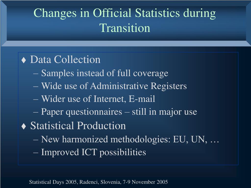 Changes in Official Statistics during Transition • Data Collection • Samples instead of full coverage • Wide use of Administrative Registers • Wider use of Internet, E-mail • Paper questionnaires – still in major use • Statistical Production • New harmonized methodologies: EU, UN, … • Improved ICT possibilities Statistical Days 2005, Radenci, Slovenia, 7-9 November 2005