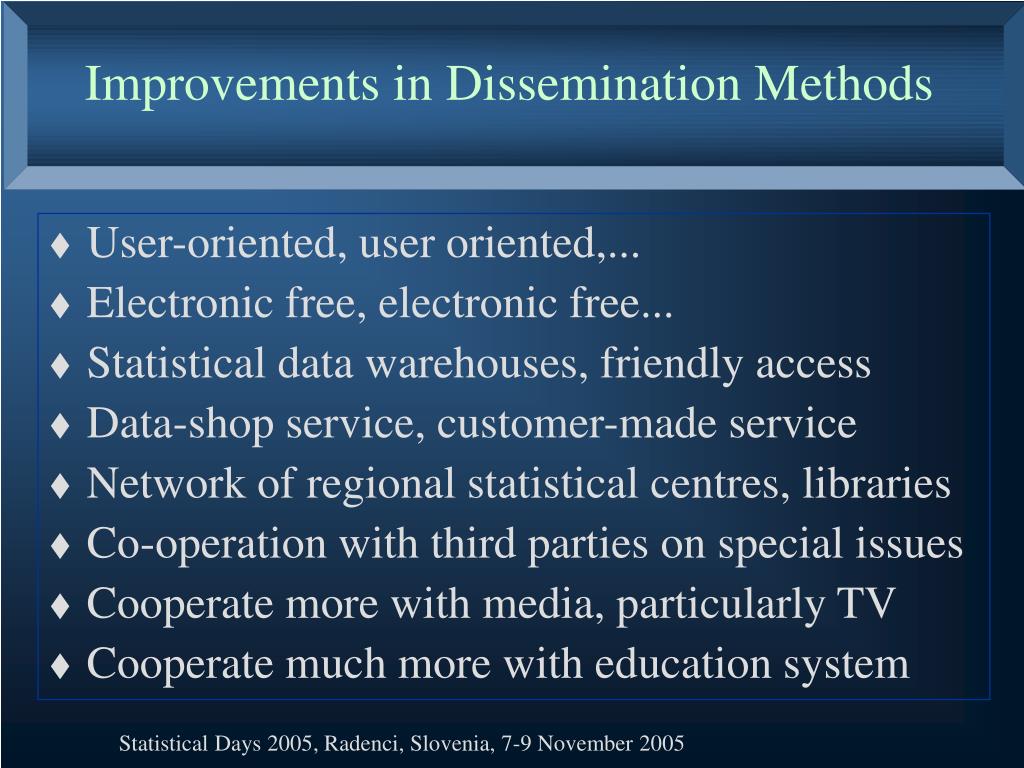 Improvements in Dissemination Methods • User-oriented, user oriented,... • Electronic free, electronic free... • Statistical data warehouses, friendly access • Data-shop service, customer-made service • Network of regional statistical centres, libraries • Co-operation with third parties on special issues • Cooperate more with media, particularly TV • Cooperate much more with education system Statistical Days 2005, Radenci, Slovenia, 7-9 November 2005