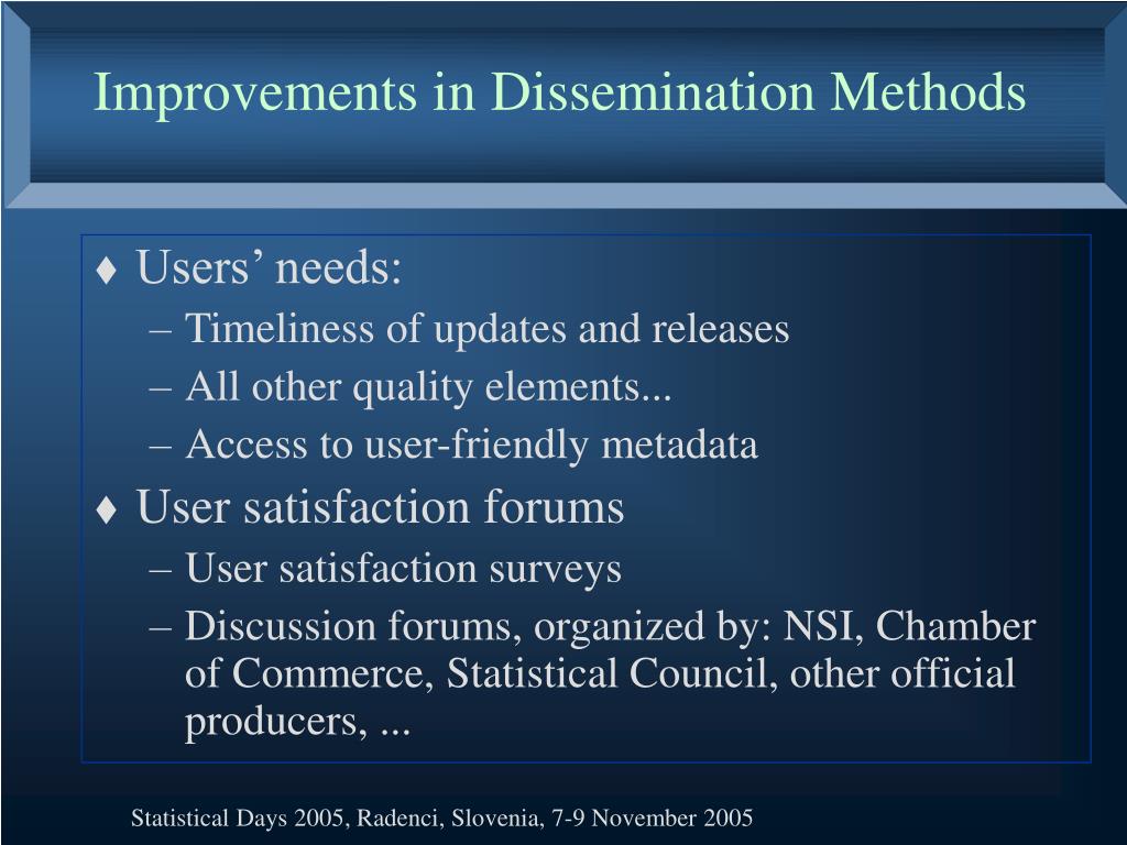 Improvements in Dissemination Methods • Users’ needs: • Timeliness of updates and releases • All other quality elements... • Access to user-friendly metadata • User satisfaction forums • User satisfaction surveys • Discussion forums, organized by: NSI, Chamber of Commerce, Statistical Council, other official producers, ... Statistical Days 2005, Radenci, Slovenia, 7-9 November 2005