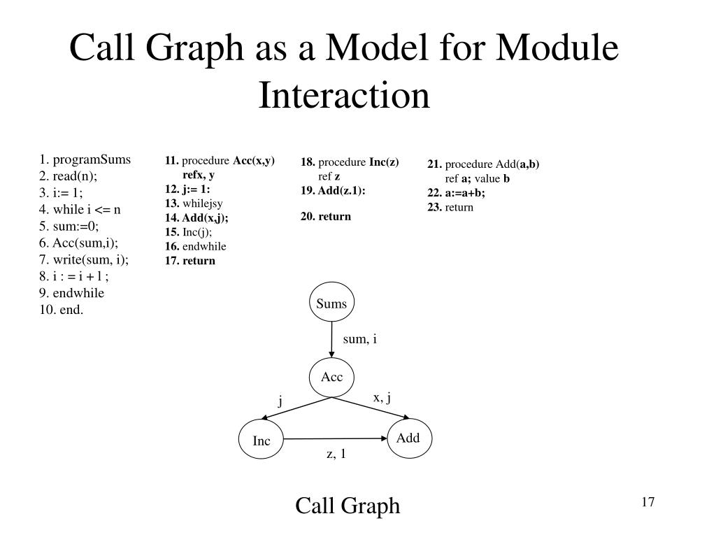 Call Graph as a Model for Module Interaction 11. procedure Acc(x,y) refx, y 12. j:= 1: 13. whilejsy 14. Add(x,j); 15. Inc(j); 16. endwhile 17. return 18. procedure Inc(z) ref z 19. Add(z.1): 20. return 21. procedure Add(a,b) ref a; value b 22. a:=a+b; 23. return 1. programSums 2. read(n); 3. i:= 1; 4. while i <= n 5. sum:=0; 6. Acc(sum,i); 7. write(sum, i); 8. i : = i + l ; 9. endwhile 10. end. Sums sum, i Acc x, j j Add Inc z, 1 Call Graph