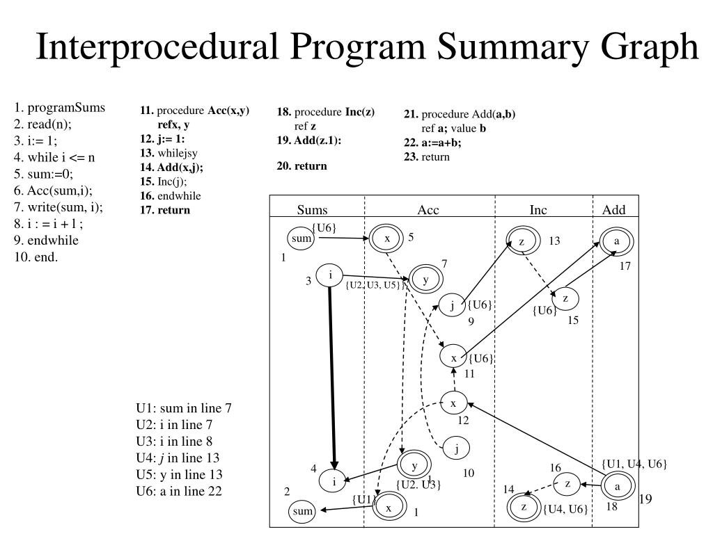 Interprocedural Program Summary Graph 11. procedure Acc(x,y) refx, y 12. j:= 1: 13. whilejsy 14. Add(x,j); 15. Inc(j); 16. endwhile 17. return 18. procedure Inc(z) ref z 19. Add(z.1): 20. return 21. procedure Add(a,b) ref a; value b 22. a:=a+b; 23. return 1. programSums 2. read(n); 3. i:= 1; 4. while i <= n 5. sum:=0; 6. Acc(sum,i); 7. write(sum, i); 8. i : = i + l ; 9. endwhile 10. end. Sums Acc Inc Add {U6} 5 x sum a 13 z 1 7 17 i y 3 {U2, U3, U5}} z {U6} j {U6} 15 9 x {U6} 11 x U1: sum in line 7 U2: i in line 7 U3: i in line 8 U4: j in line 13 U5: y in line 13 U6: a in line 22 12 j {U1, U4, U6} y 16 4 10 1 i z {U2. U3} a 14 2 {U1} z 18 x {U4, U6} sum 1