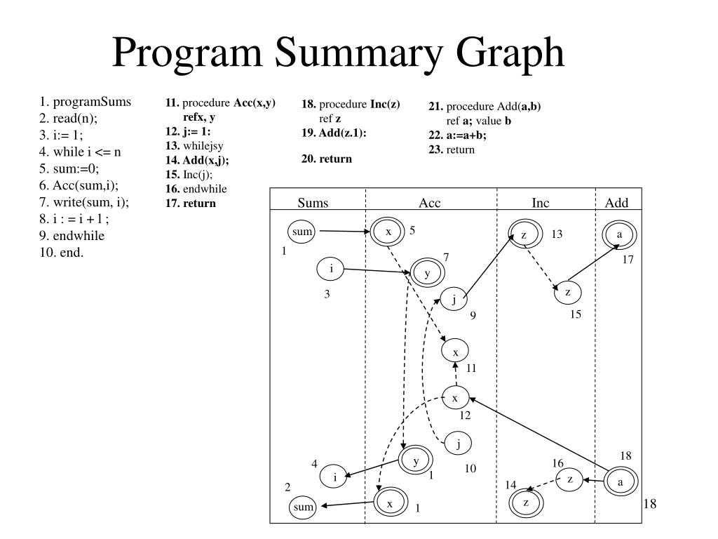 Program Summary Graph 11. procedure Acc(x,y) refx, y 12. j:= 1: 13. whilejsy 14. Add(x,j); 15. Inc(j); 16. endwhile 17. return 18. procedure Inc(z) ref z 19. Add(z.1): 20. return 21. procedure Add(a,b) ref a; value b 22. a:=a+b; 23. return 1. programSums 2. read(n); 3. i:= 1; 4. while i <= n 5. sum:=0; 6. Acc(sum,i); 7. write(sum, i); 8. i : = i + l ; 9. endwhile 10. end. Sums Acc Inc Add 5 x sum a 13 z 1 7 17 i y z 3 j 15 9 x 11 x 12 j 18 y 16 4 10 1 i z a 14 2 z x sum 1