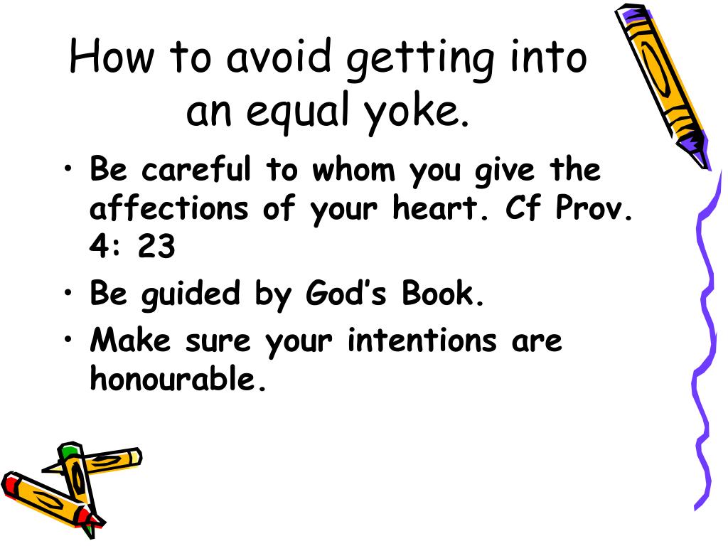 How to avoid getting into an equal yoke. • Be careful to whom you give the affections of your heart. Cf Prov. 4: 23 • Be guided by God’s Book. • Make sure your intentions are honourable.