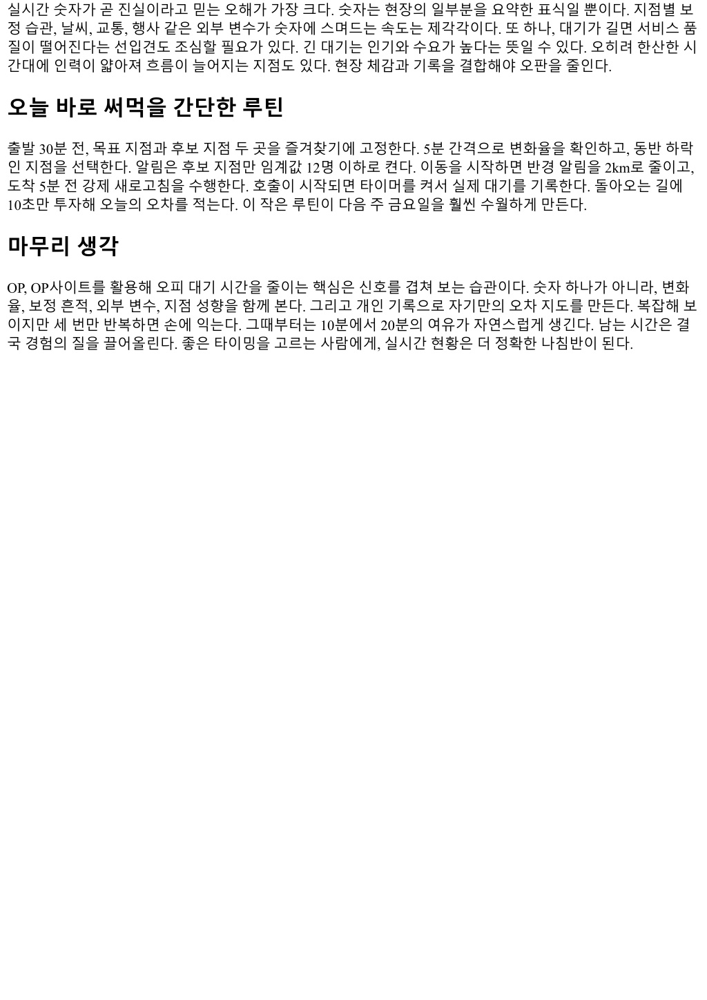 평일 11시전과오후 3시이후는전형적으로워크인효율이좋다. 예약취소가드문시간대이며, 점심과저녁사 이에인력이비교적안정적으로돌아간다. 반면금요일 18시이후나토요일오후는예약우선전략이유리하다. 워크인은대기급증의영향권에놓이기쉽고, 현장임기응변으로처리가능한폭이좁아진다. 이를테면금요일 18시예약을잡아두고, 당일 16시전까지 OP사이트의실시간대기를두세차례확인해변동성이크면시간대를 한칸당기는방식이유효하다. 실시간현황에신뢰도를매기는법 실시간숫자를쓸만한정보로바꾸려면신뢰도판단이선행돼야한다. 다음기준을조합해체감정확도를높일 수있다. 짧은구간에서의변화방향: 5분, 10분, 15분구간을나눠각구간에서대기인원과예상시간이같은방향 으로움직이면신뢰도가높다. 예컨대대기인원이 14에서 11로, 예상시간이 35분에서 30분으로동반하락 했다면실질감소로볼확률이크다. 이벤트감지: 돌발적인급락이나급등은 1회로단정하지말고두차례 이상확인한다. 10분내반전되면시스템보정이늦거나취소-재예약이겹친케이스다. 지점별편차: 같은 상권내지점간혼잡편차가클수록특정지점의데이터신뢰도는낮아진다. 배치나입력지연가능성을 염두에두자. 사용자리뷰타임스탬프: 최근 24시간내 “표시보다길었다”, “표시보다빨랐다” 같은코멘트 의방향성은생각보다정확하다. 다만감정섞인극단적평가는평균판단에서제외한다. 알림지연여부: 앱푸시가 3분이상늦게도착하는날은전체동기화가흔들린다. 이때는표시에 10에서 20분의안전마진 을두는편이낫다. 여기까지가첫번째이자가장실전적인리스트다. 나머지는문장으로풀어보겠다. 리프레시주기와체류비용의균형 너무자주새로고침하면오히려잘못된결정을내리기쉽다. 작은진동을큰변동으로착각하기때문이다. 5분 주기로상태를확인하고, 변화가큰피크구간에는 3분으로좁혀보는방식을추천한다. 1분이하주기는잡음이 많다. 반대로 10분이상벌리면좋은타이밍을놓친다. 현장에서대기할때는실제처리속도를체감할수있으니 7분정도로넓혀도무방하다. 이때중요한것이체류비용이다. 이동시간 20분, 대기 30분, 이용시간 60분이라면총 110분을점유한다. 일정이 타이트한날에는이동과대기중최소하나는줄여야한다. 대기가긴상권으로이동할경우, 길위에서만드는 20분이실제대기 10분절감과바꾸기어려울때가많다. OP사이트의지점간비교를활용할때, 거리와정체시 간까지감안한총소요를계산해두면낭비를줄일수있다. 과거데이터로오늘을읽는습관 실시간화면만바라보면전체맥락을놓친다. 대부분의 OP, 오피사이트는일자별혼잡패턴을제공한다. 이그래 프에서봐야할포인트는꼭대기의높이보다구간폭이다. 꼭대기가높더라도폭이좁으면잠깐만피해도된다. 반대로고점이낮아보여도고점구간이넓으면실질회피가어렵다. 지난주같은요일의 2시간구간패턴을기 준으로, 오늘지표가상단으로올라붙기시작하는시점이언제인지메모해두면다음주같은요일에선제대응 이가능하다. 숫자에강하지않은사람도어렵지않다. 15분단위로스크린샷을 3장만남겨도, 다음에같은시간대를체크할 때감이생긴다. 체감상오차가줄어드는정도는 20에서 30퍼센트정도다. 예약대기알고리즘의보정흔적읽기 일부 OP사이트는예약타임슬롯을정각기준으로끊어제공한다. 정각전후 5분구간에서예상대기가갑자기 늘거나줄었다면, 알고리즘이슬롯보정을수행한것으로읽을수있다. 정각직전의급증은실대기보다과대추 정일때가많다. 이때는정각이후로한칸밀거나, 인접지점의같은슬롯을비교해유리한쪽을고른다. 반대로, 정각직후의급감은과소추정일가능성이있으니현장도착전재확인이필수다.