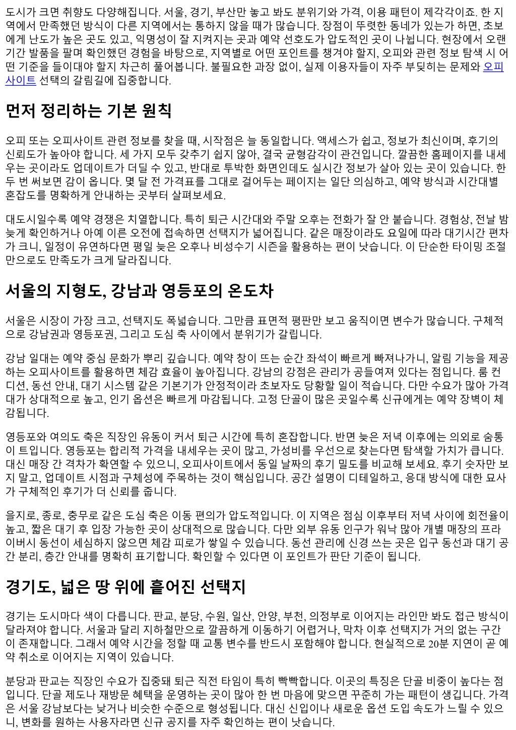 도시가크면취향도다양해집니다. 서울, 경기, 부산만놓고봐도분위기와가격, 이용패턴이제각각이죠. 한지 역에서만족했던방식이다른지역에서는통하지않을때가많습니다. 장점이뚜렷한동네가있는가하면, 초보 에게난도가높은곳도있고, 익명성이잘지켜지는곳과예약선호도가압도적인곳이나뉩니다. 현장에서오랜 기간발품을팔며확인했던경험을바탕으로, 지역별로어떤포인트를챙겨야할지, 오피와관련정보탐색시어 떤기준을들이대야할지차근히풀어봅니다. 불필요한과장없이, 실제이용자들이자주부딪히는문제와오피 사이트선택의갈림길에집중합니다. 먼저정리하는기본원칙 오피또는오피사이트관련정보를찾을때, 시작점은늘동일합니다. 액세스가쉽고, 정보가최신이며, 후기의 신뢰도가높아야합니다. 세가지모두갖추기쉽지않아, 결국균형감각이관건입니다. 깔끔한홈페이지를내세 우는곳이라도업데이트가더딜수있고, 반대로투박한화면인데도실시간정보가살아있는곳이있습니다. 한 두번써보면감이옵니다. 몇달전가격표를그대로걸어두는페이지는일단의심하고, 예약방식과시간대별 혼잡도를명확하게안내하는곳부터살펴보세요. 대도시일수록예약경쟁은치열합니다. 특히퇴근시간대와주말오후는전화가잘안붙습니다. 경험상, 전날밤 늦게확인하거나아예이른오전에접속하면선택지가넓어집니다. 같은매장이라도요일에따라대기시간편차 가크니, 일정이유연하다면평일늦은오후나비성수기시즌을활용하는편이낫습니다. 이단순한타이밍조절 만으로도만족도가크게달라집니다. 서울의지형도, 강남과영등포의온도차 서울은시장이가장크고, 선택지도폭넓습니다. 그만큼표면적평판만보고움직이면변수가많습니다. 구체적 으로강남권과영등포권, 그리고도심축사이에서분위기가갈립니다. 강남일대는예약중심문화가뿌리깊습니다. 예약창이뜨는순간좌석이빠르게빠져나가니, 알림기능을제공 하는오피사이트를활용하면체감효율이높아집니다. 강남의강점은관리가공들여져있다는점입니다. 룸컨 디션, 동선안내, 대기시스템같은기본기가안정적이라초보자도당황할일이적습니다. 다만수요가많아가격 대가상대적으로높고, 인기옵션은빠르게마감됩니다. 고정단골이많은곳일수록신규에게는예약장벽이체 감됩니다. 영등포와여의도축은직장인유동이커서퇴근시간에특히혼잡합니다. 반면늦은저녁이후에는의외로숨통 이트입니다. 영등포는합리적가격을내세우는곳이많고, 가성비를우선으로찾는다면탐색할가치가큽니다. 대신매장간격차가확연할수있으니, 오피사이트에서동일날짜의후기밀도를비교해보세요. 후기숫자만보 지말고, 업데이트시점과구체성에주목하는것이핵심입니다. 공간설명이디테일하고, 응대방식에대한묘사 가구체적인후기가더신뢰를줍니다. 을지로, 종로, 충무로같은도심축은이동편의가압도적입니다. 이지역은점심이후부터저녁사이에회전율이 높고, 짧은대기후입장가능한곳이상대적으로많습니다. 다만외부유동인구가워낙많아개별매장의프라 이버시동선이세심하지않으면체감피로가쌓일수있습니다. 동선관리에신경쓰는곳은입구동선과대기공 간분리, 층간안내를명확히표기합니다. 확인할수있다면이포인트가판단기준이됩니다. 경기도, 넓은땅위에흩어진선택지 경기는도시마다색이다릅니다. 판교, 분당, 수원, 일산, 안양, 부천, 의정부로이어지는라인만봐도접근방식이 달라져야합니다. 서울과달리지하철만으로깔끔하게이동하기어렵거나, 막차이후선택지가거의없는구간 이존재합니다. 그래서예약시간을정할때교통변수를반드시포함해야합니다. 현실적으로 20분지연이곧예 약취소로이어지는지역이있습니다. 분당과판교는직장인수요가집중돼퇴근직전타임이특히빡빡합니다. 이곳의특징은단골비중이높다는점 입니다. 단골제도나재방문혜택을운영하는곳이많아한번마음에맞으면꾸준히가는패턴이생깁니다. 가격 은서울강남보다는낮거나비슷한수준으로형성됩니다. 대신신입이나새로운옵션도입속도가느릴수있으 니, 변화를원하는사용자라면신규공지를자주확인하는편이낫습니다.
