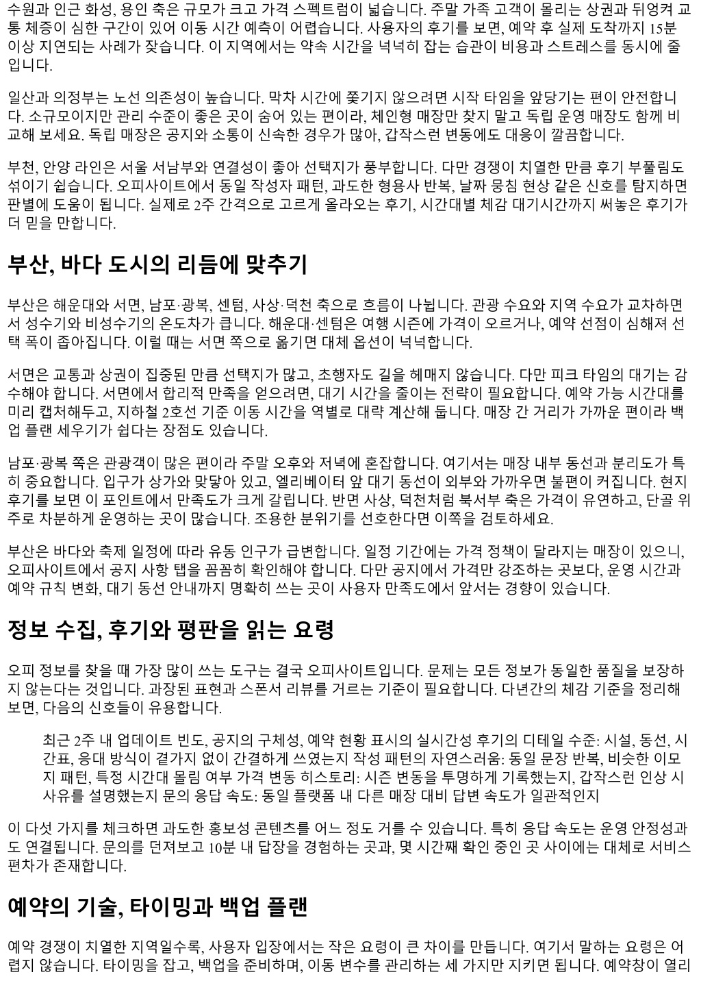 수원과인근화성, 용인축은규모가크고가격스펙트럼이넓습니다. 주말가족고객이몰리는상권과뒤엉켜교 통체증이심한구간이있어이동시간예측이어렵습니다. 사용자의후기를보면, 예약후실제도착까지 15분 이상지연되는사례가잦습니다. 이지역에서는약속시간을넉넉히잡는습관이비용과스트레스를동시에줄 입니다. 일산과의정부는노선의존성이높습니다. 막차시간에쫓기지않으려면시작타임을앞당기는편이안전합니 다. 소규모이지만관리수준이좋은곳이숨어있는편이라, 체인형매장만찾지말고독립운영매장도함께비 교해보세요. 독립매장은공지와소통이신속한경우가많아, 갑작스런변동에도대응이깔끔합니다. 부천, 안양라인은서울서남부와연결성이좋아선택지가풍부합니다. 다만경쟁이치열한만큼후기부풀림도 섞이기쉽습니다. 오피사이트에서동일작성자패턴, 과도한형용사반복, 날짜뭉침현상같은신호를탐지하면 판별에도움이됩니다. 실제로 2주간격으로고르게올라오는후기, 시간대별체감대기시간까지써놓은후기가 더믿을만합니다. 부산, 바다도시의리듬에맞추기 부산은해운대와서면, 남포·광복, 센텀, 사상·덕천축으로흐름이나뉩니다. 관광수요와지역수요가교차하면 서성수기와비성수기의온도차가큽니다. 해운대·센텀은여행시즌에가격이오르거나, 예약선점이심해져선 택폭이좁아집니다. 이럴때는서면쪽으로옮기면대체옵션이넉넉합니다. 서면은교통과상권이집중된만큼선택지가많고, 초행자도길을헤매지않습니다. 다만피크타임의대기는감 수해야합니다. 서면에서합리적만족을얻으려면, 대기시간을줄이는전략이필요합니다. 예약가능시간대를 미리캡처해두고, 지하철 2호선기준이동시간을역별로대략계산해둡니다. 매장간거리가가까운편이라백 업플랜세우기가쉽다는장점도있습니다. 남포·광복쪽은관광객이많은편이라주말오후와저녁에혼잡합니다. 여기서는매장내부동선과분리도가특 히중요합니다. 입구가상가와맞닿아있고, 엘리베이터앞대기동선이외부와가까우면불편이커집니다. 현지 후기를보면이포인트에서만족도가크게갈립니다. 반면사상, 덕천처럼북서부축은가격이유연하고, 단골위 주로차분하게운영하는곳이많습니다. 조용한분위기를선호한다면이쪽을검토하세요. 부산은바다와축제일정에따라유동인구가급변합니다. 일정기간에는가격정책이달라지는매장이있으니, 오피사이트에서공지사항탭을꼼꼼히확인해야합니다. 다만공지에서가격만강조하는곳보다, 운영시간과 예약규칙변화, 대기동선안내까지명확히쓰는곳이사용자만족도에서앞서는경향이있습니다. 정보수집, 후기와평판을읽는요령 오피정보를찾을때가장많이쓰는도구는결국오피사이트입니다. 문제는모든정보가동일한품질을보장하 지않는다는것입니다. 과장된표현과스폰서리뷰를거르는기준이필요합니다. 다년간의체감기준을정리해 보면, 다음의신호들이유용합니다. 최근 2주내업데이트빈도, 공지의구체성, 예약현황표시의실시간성후기의디테일수준: 시설, 동선, 시 간표, 응대방식이곁가지없이간결하게쓰였는지작성패턴의자연스러움: 동일문장반복, 비슷한이모 지패턴, 특정시간대몰림여부가격변동히스토리: 시즌변동을투명하게기록했는지, 갑작스런인상시 사유를설명했는지문의응답속도: 동일플랫폼내다른매장대비답변속도가일관적인지 이다섯가지를체크하면과도한홍보성콘텐츠를어느정도거를수있습니다. 특히응답속도는운영안정성과 도연결됩니다. 문의를던져보고 10분내답장을경험하는곳과, 몇시간째확인중인곳사이에는대체로서비스 편차가존재합니다. 예약의기술, 타이밍과백업플랜 예약경쟁이치열한지역일수록, 사용자입장에서는작은요령이큰차이를만듭니다. 여기서말하는요령은어 렵지않습니다. 타이밍을잡고, 백업을준비하며, 이동변수를관리하는세가지만지키면됩니다. 예약창이열리
