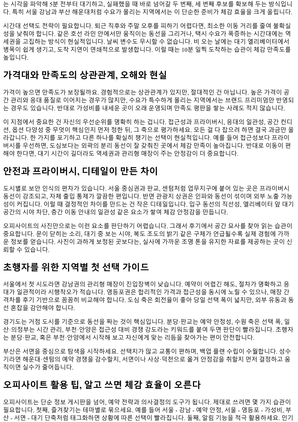 는시각을파악해 5분전부터대기하고, 실패했을때바로넘어갈두번째, 세번째후보를확보해두는방식입니 다. 특히서울강남과부산해운대처럼수요가몰리는지역에서는이단순한준비가체감효율을크게올립니다. 시간대선택도전략이필요합니다. 퇴근직후와주말오후를피하기어렵다면, 최소한이동거리를줄여불확실 성을낮춰야합니다. 같은호선라인안에서만움직이는동선을그리거나, 택시수요가폭증하는시간대에는역 세권을고집하는방식이현실적입니다. 날씨변수도무시할수없습니다. 비오는날에는대기엘리베이터에서 병목이쉽게생기고, 도착지연이연쇄적으로발생합니다. 이럴때는 10분일찍도착하는습관이체감만족도를 높입니다. 가격대와만족도의상관관계, 오해와현실 가격이높으면만족도가보장될까요. 경험적으로는상관관계가있지만, 절대적인건아닙니다. 높은가격이공 간관리와응대품질로이어지는경우가많지만, 수요가특수하게몰리는지역에서는브랜드프리미엄만반영되 는경우도있습니다. 반대로가성비를내세운곳이오래운영되며만족도평판을쌓는사례도적지않습니다. 이지점에서중요한건자신의우선순위를명확히하는겁니다. 접근성과프라이버시, 응대의일관성, 공간컨디 션, 옵션다양성중무엇이핵심인지먼저정한뒤, 그축으로평가하세요. 모든걸다잡으려하면결국과금만올 라갑니다. 한가지를포기하고다른하나를확실히챙기는선택이현실적입니다. 예를들어접근성보다프라이 버시를우선하면, 도심보다는외곽의분리동선이잘갖춰진곳에서체감만족이높아집니다. 반대로이동이편 해야한다면, 대기시간이길더라도역세권과관리형매장이주는안정감이더중요합니다. 안전과프라이버시, 디테일이만든차이 도시별로보안인식의편차가있습니다. 서울중심권과판교, 센텀처럼업무지구에붙어있는곳은프라이버시 동선이강조되고, 자체출입통제가깔끔한편입니다. 반면관광지상권은인파와동선이섞이며외부노출가능 성이커집니다. 이럴때결정적인차이를만드는건작은디테일입니다. 입구동선의직선성, 엘리베이터앞대기 공간의시야차단, 층간이동안내의일관성같은요소가쌓여체감안정감을만듭니다. 오피사이트의사진만으로는이런요소를판단하기어렵습니다. 그래서후기에서공간묘사를찾아읽는습관이 중요합니다. 문이닫히는소리, 대기중보는시야, 복도조도의밝기같은구체가언급될수록실제경험에가까 운정보를얻습니다. 사진이과하게보정된곳보다는, 실사에가까운조명톤을유지한자료를제공하는곳이신 뢰할수있습니다. 초행자를위한지역별첫선택가이드 서울에서첫시도라면강남권의관리형매장이진입장벽이낮습니다. 예약이어렵긴해도, 절차가명확하고응 대가일관적이라시행착오가적습니다. 영등포권은합리적인가격과접근성을동시에노릴수있으나, 매장간 격차를후기기반으로꼼꼼히비교해야합니다. 도심축은회전율이좋아당일선택폭이넓지만, 외부유동과동 선혼잡을감안해야합니다. 경기도는거점도시를기준으로동선을짜는것이핵심입니다. 분당·판교는예약안정성, 수원축은선택폭, 일 산·의정부는시간관리, 부천·안양은접근성대비경쟁강도라는키워드를붙여두면판단이빨라집니다. 초행자 는분당·판교, 혹은부천·안양에서시작해보고자신에게맞는리듬을찾아가는편이안전합니다. 부산은서면을중심으로탐색을시작하세요. 선택지가많고교통이편하며, 백업플랜수립이수월합니다. 성수 기라면해운대·센텀의예약경쟁을감수할지, 서면이나사상·덕천으로옮겨안정감을취할지먼저결정하고움 직이면실수가줄어듭니다. 오피사이트활용팁, 알고쓰면체감효율이오른다 오피사이트는단순정보게시판을넘어, 예약전략과의사결정의도구가됩니다. 제대로쓰려면몇가지습관이 필요합니다. 첫째, 즐겨찾기는테마별로묶으세요. 예를들어서울 - 강남 - 예약안정, 서울 - 영등포 - 가성비, 부 산 - 서면 - 대기단축처럼태그화하면상황에따른선택이빨라집니다. 둘째, 알림기능을적극활용하세요. 인기